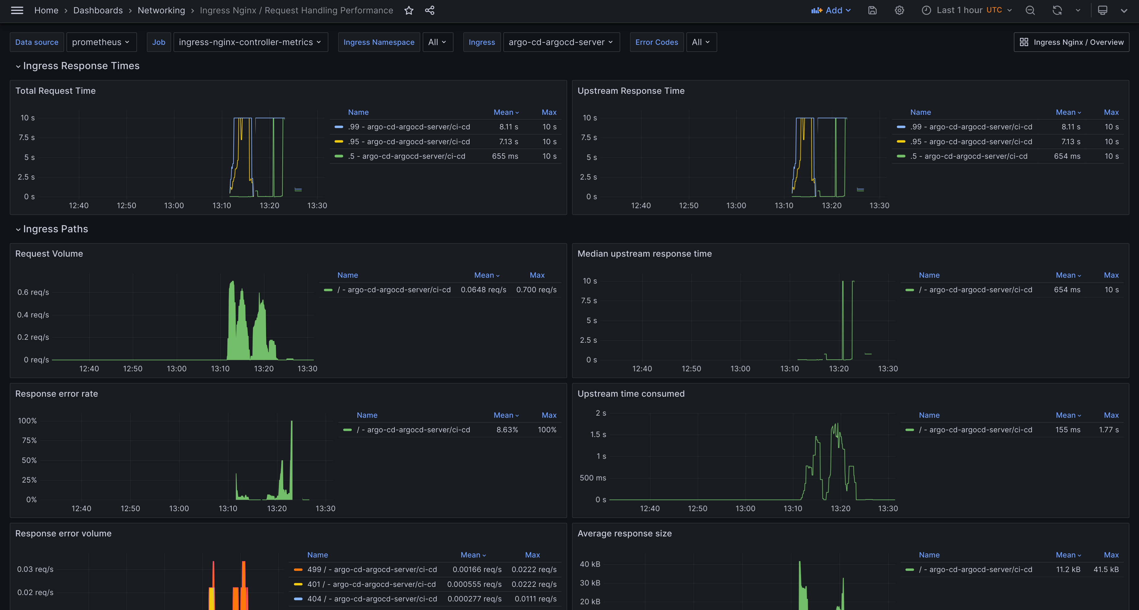 The Ingress Nginx / Request Handling Performance dashboard uses the data source to create a Grafana dashboard with the panel.
