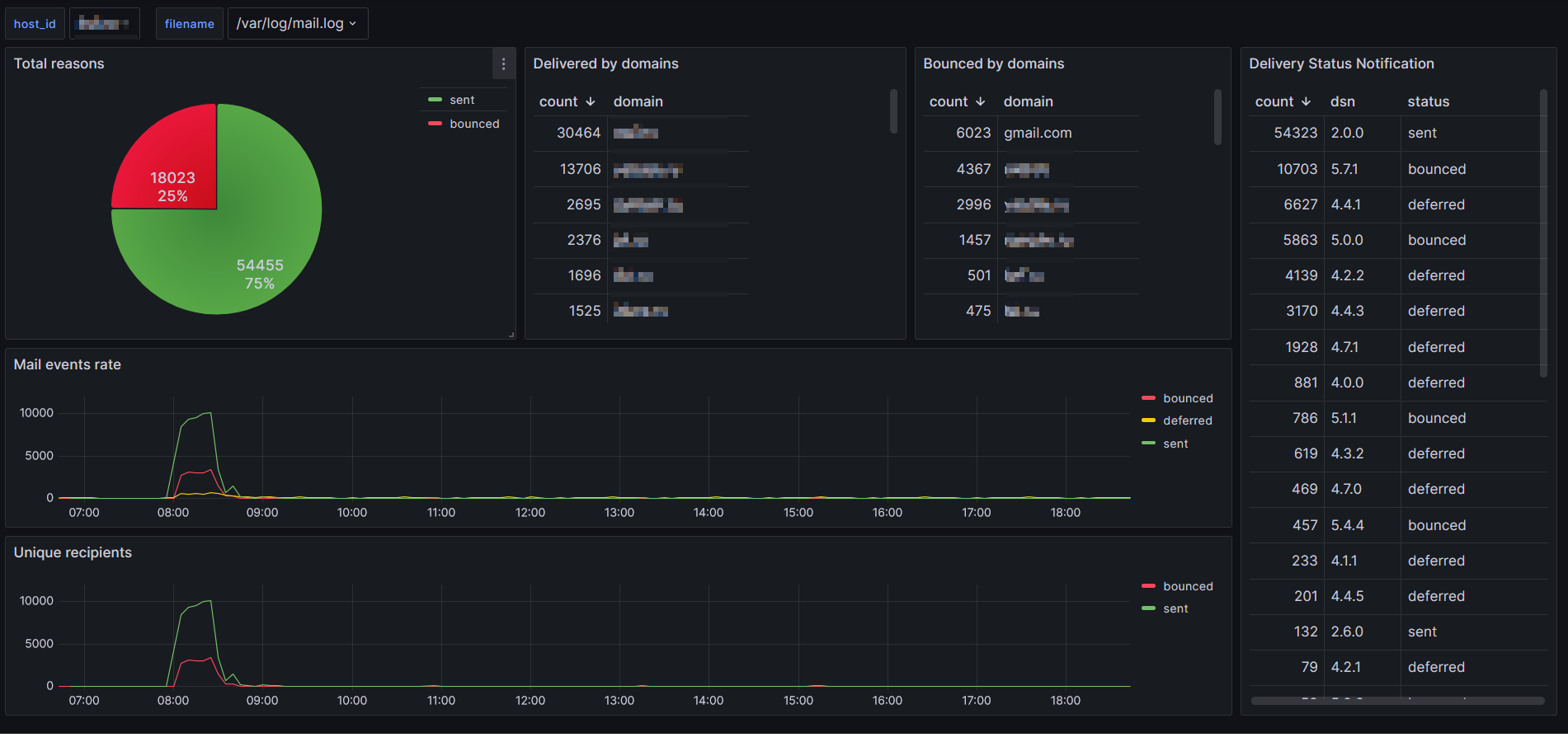 For extra large mail volumes, some values cannot be counted. In this case, consider increase Loki settings (see https://github.com/grafana/loki/issues/3045) .