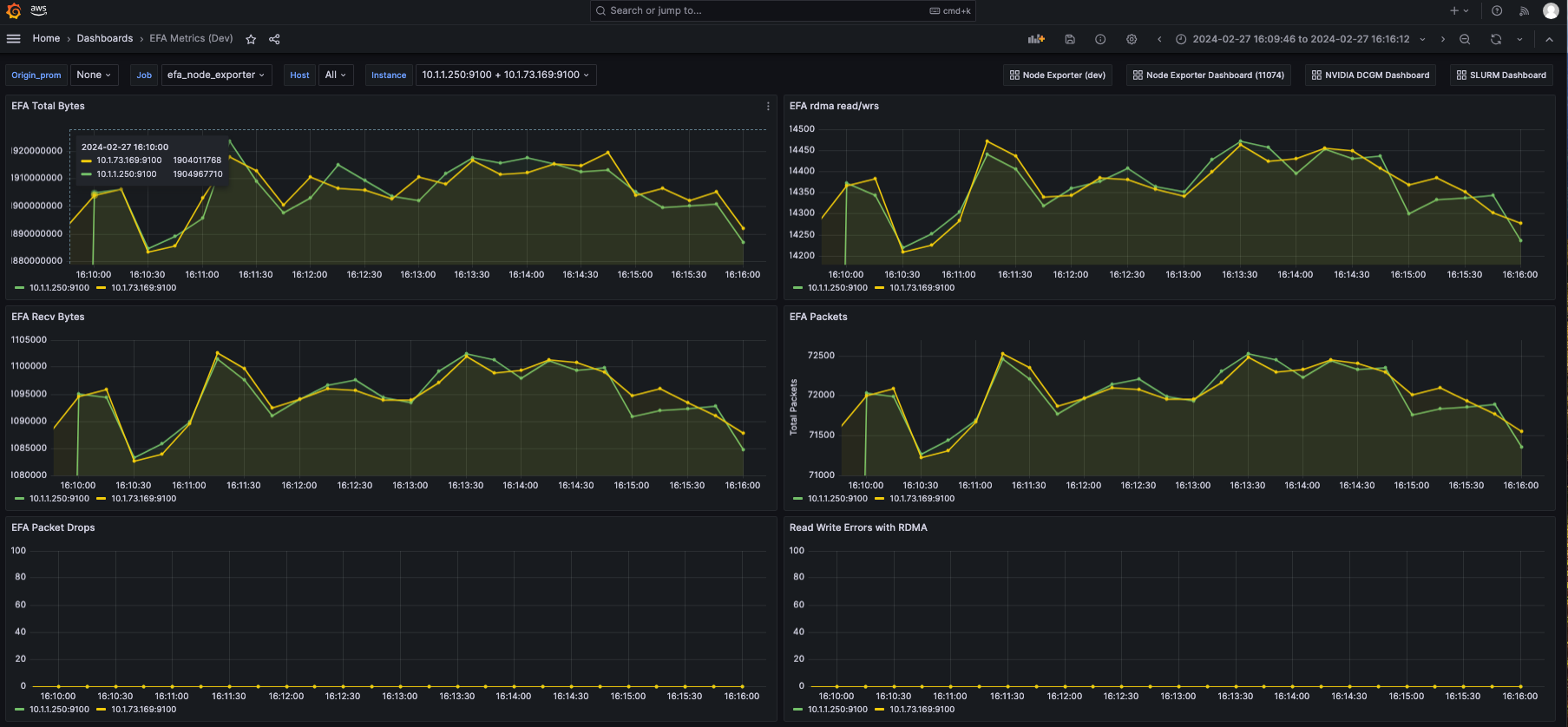 This dashboard can be used to display EFA specific metrics emitted by EFA Node Exporter, a scripted fork of the Prometheus Node Exporter and ProcFS repositories on compatible instances including p5.48xlarge, p4d.24xlarge, p4de.24xlarge, trn1.32xlarge, g5.48xlarge. The Dashboard uses Amazon Managed Prometheus as a datasource.