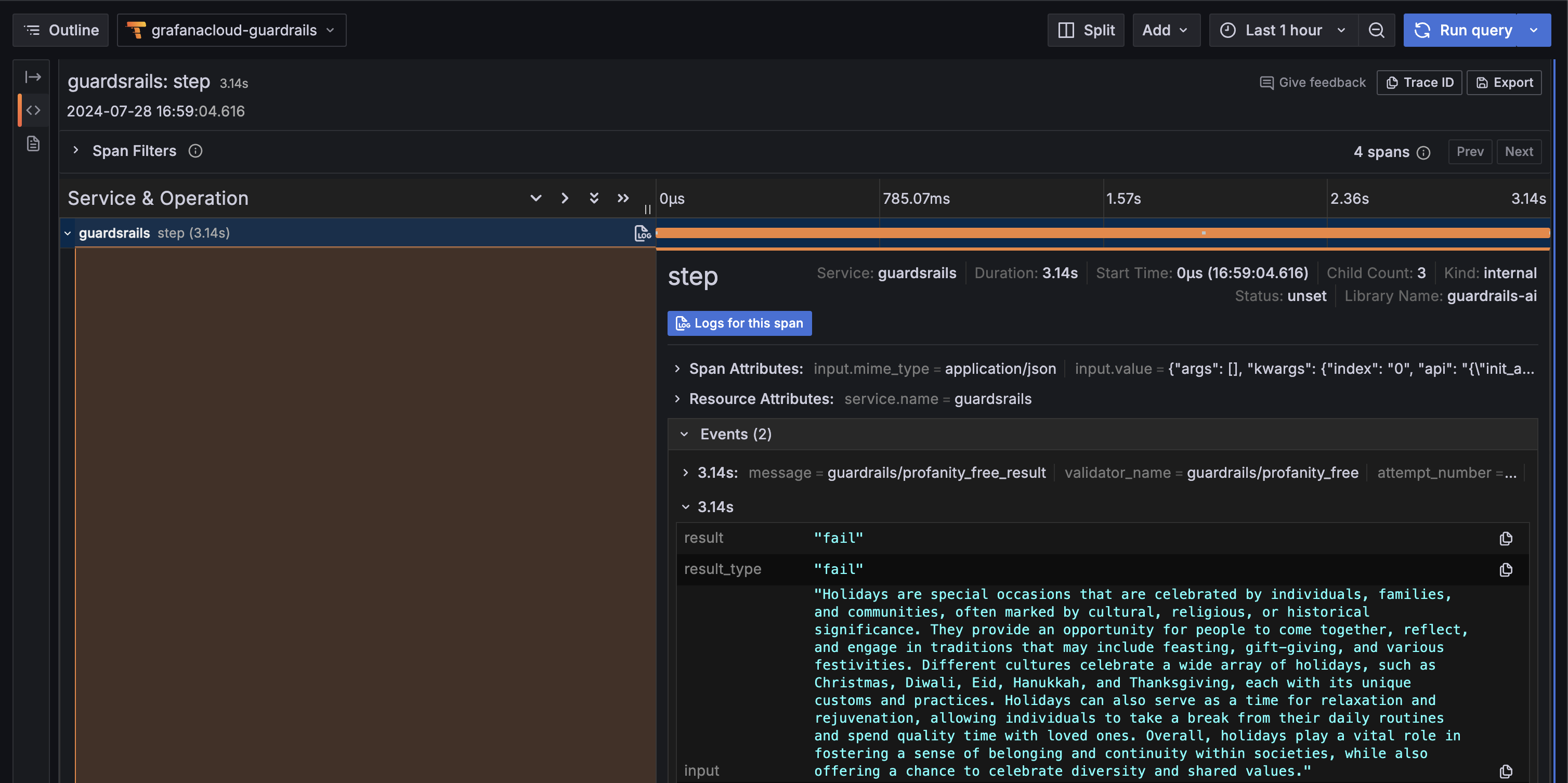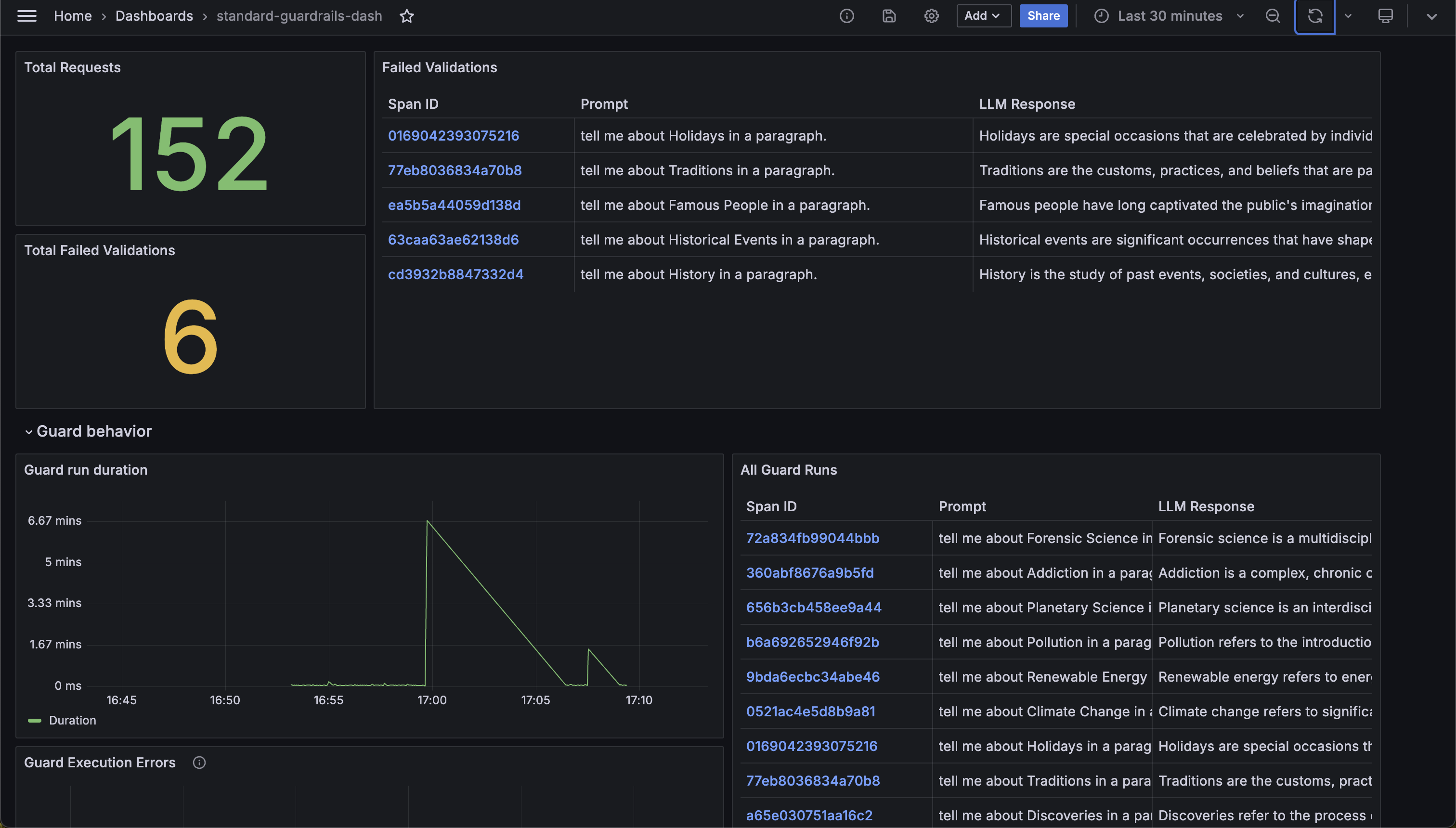 The Guardrails Starter Dashboard dashboard uses the tempo data source to create a Grafana dashboard with the stat, table and timeseries panels.