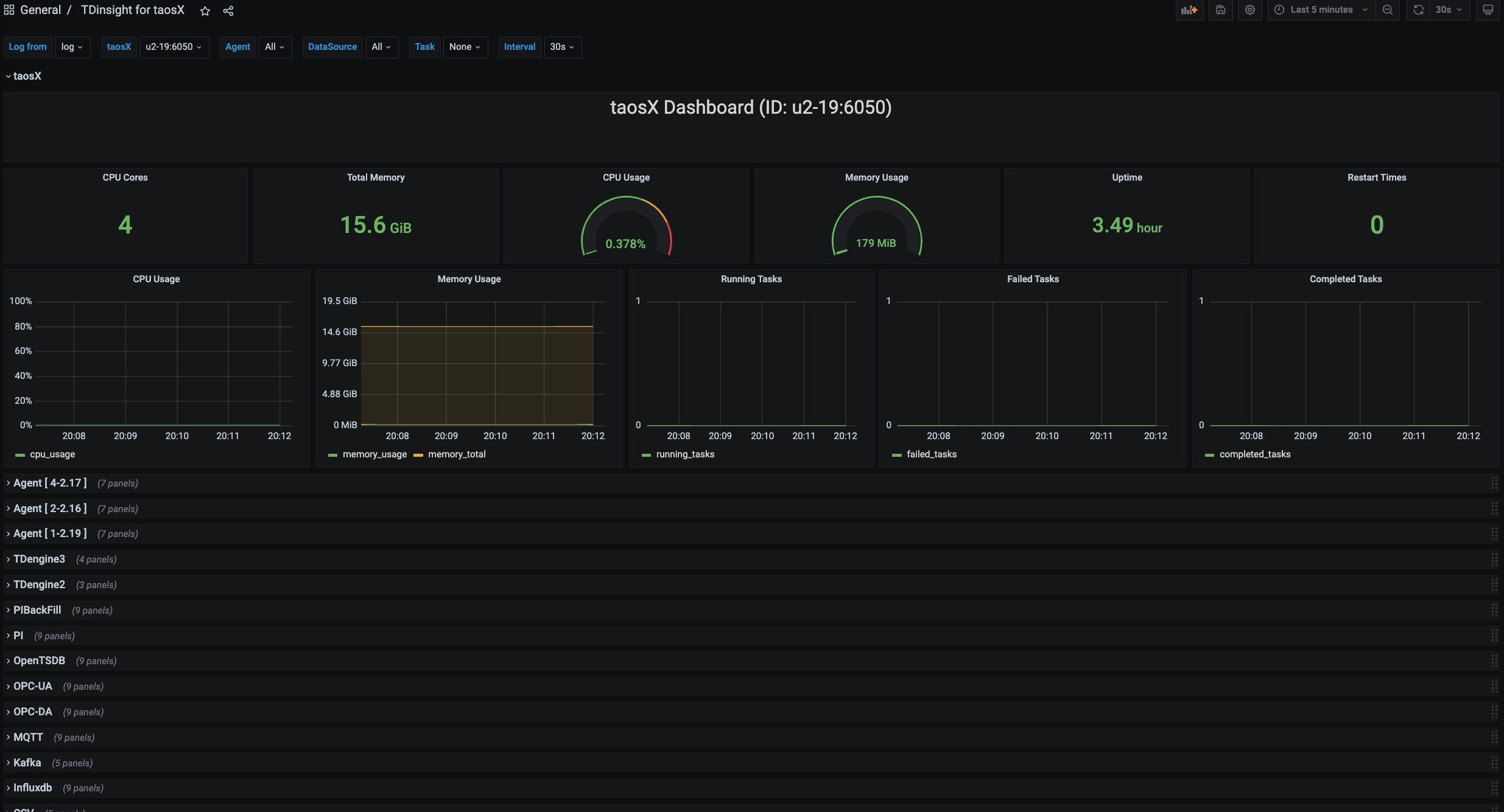TaosX is a zero-code platform for data access, synchronization, backup, and recovery of TDengine, and is an important feature of TDengine Enterprise Edition. TDinsight for taosX is a real-time display plugin used to monitor various components of taosX such as Agent, Connector, and various data source tasks. It is very simple to install and use.