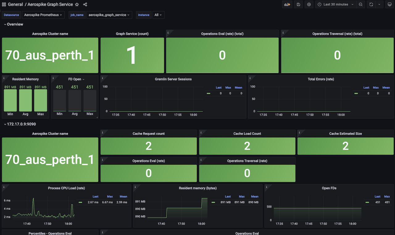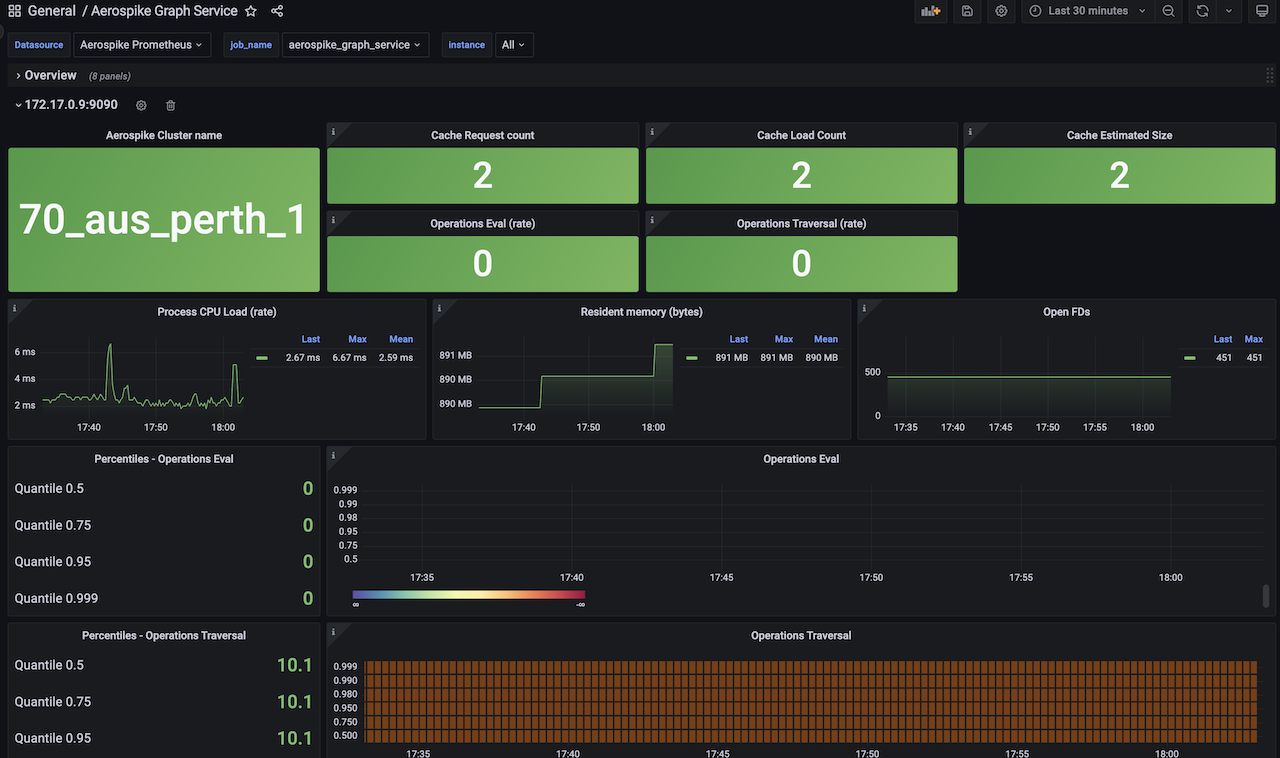 The Aerospike Graph Service dashboard uses the prometheus data source to create a Grafana dashboard with the bargauge, gauge, stat, text and timeseries panels.