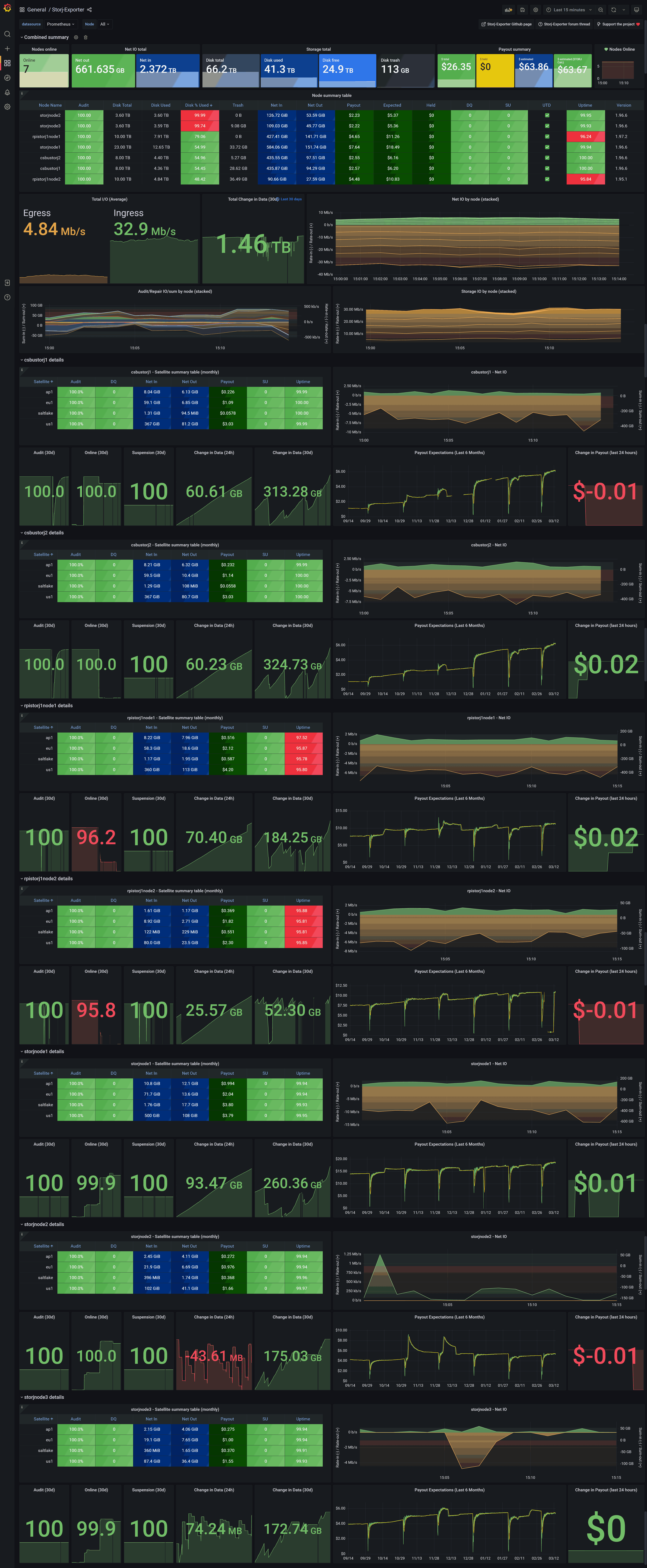 This dashboard is published on Github. Please post any issues or additional Storj-Exporter dashboards there.