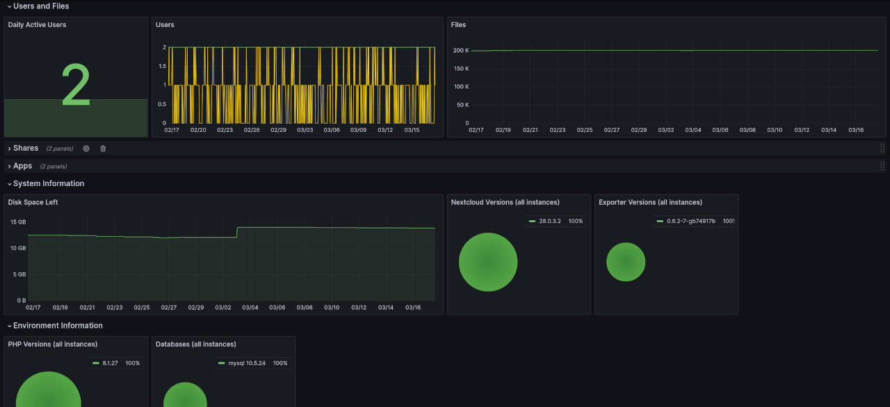 Dashboard showing metrics gathered from an instance of the Nextcloud personal cloud service using the nextcloud-exporter. The dashboard gives an overview of the usage of a single instance but can also be used to track software and environment versions across multiple instances.