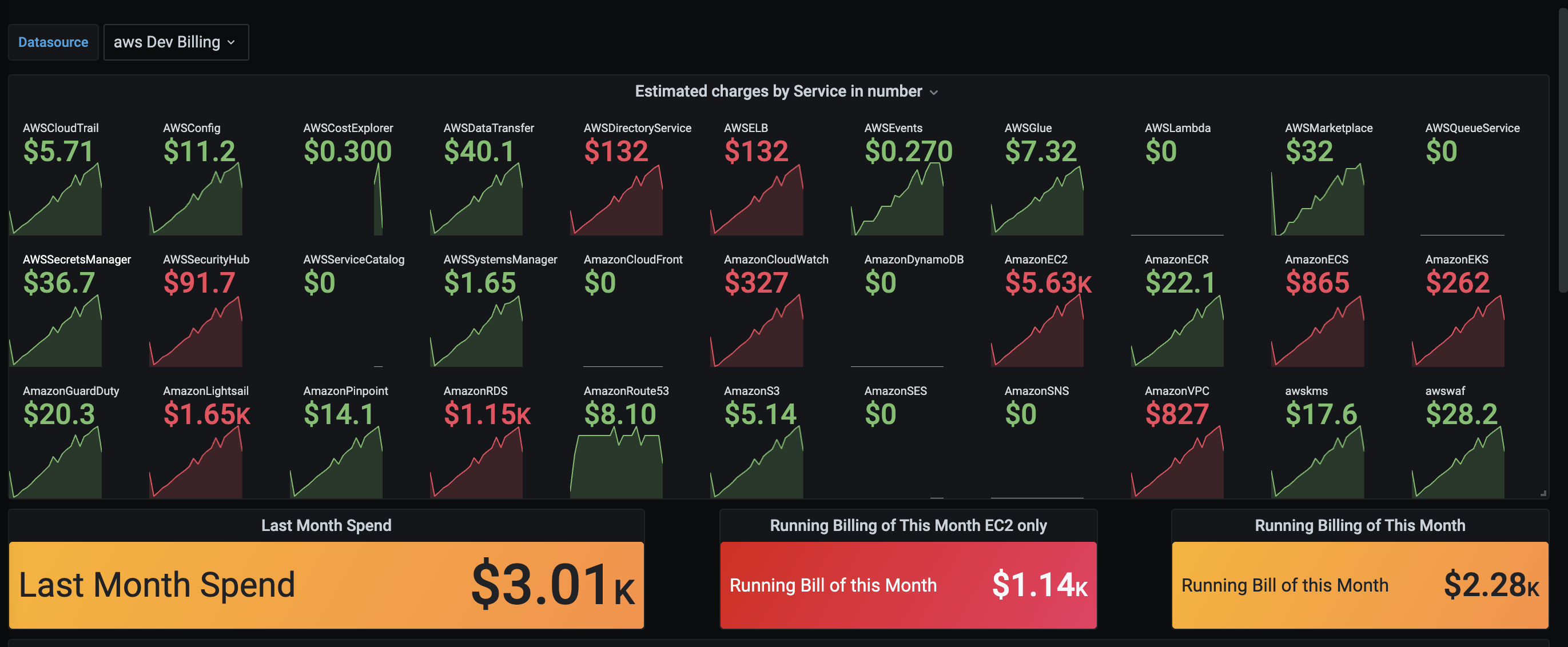 Visualize estimated AWS charges per AWS resource like EC2, S3, ..., also Visualized the last moth billing with running month billing