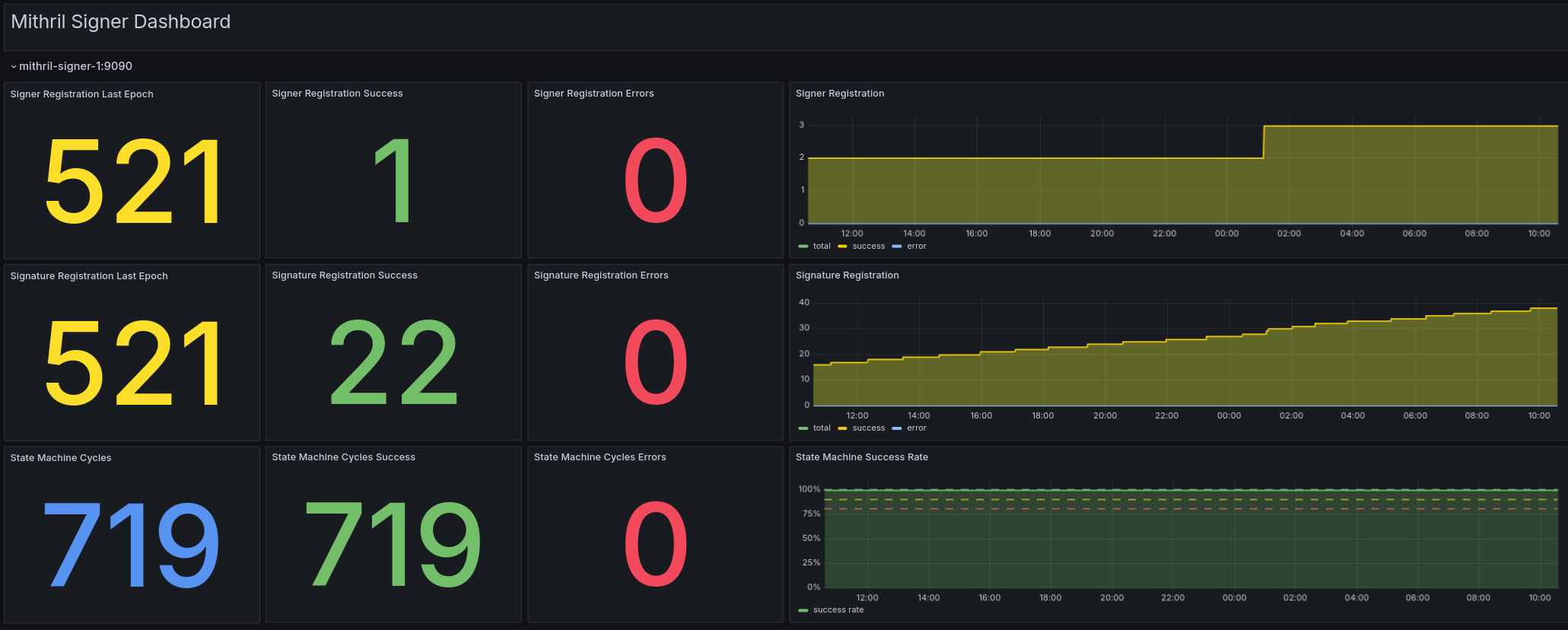 With this dashboard you can leverage the Prometheus endpoint of your Mithril signer node to visualize its key metrics.