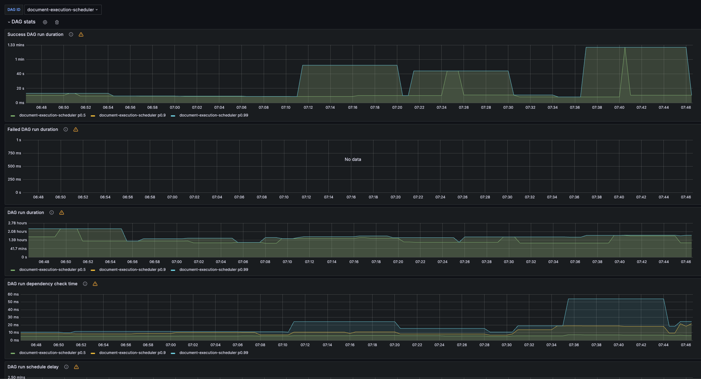 The Airflow DAG dashboard dashboard uses the prometheus data source to create a Grafana dashboard with the timeseries panel.