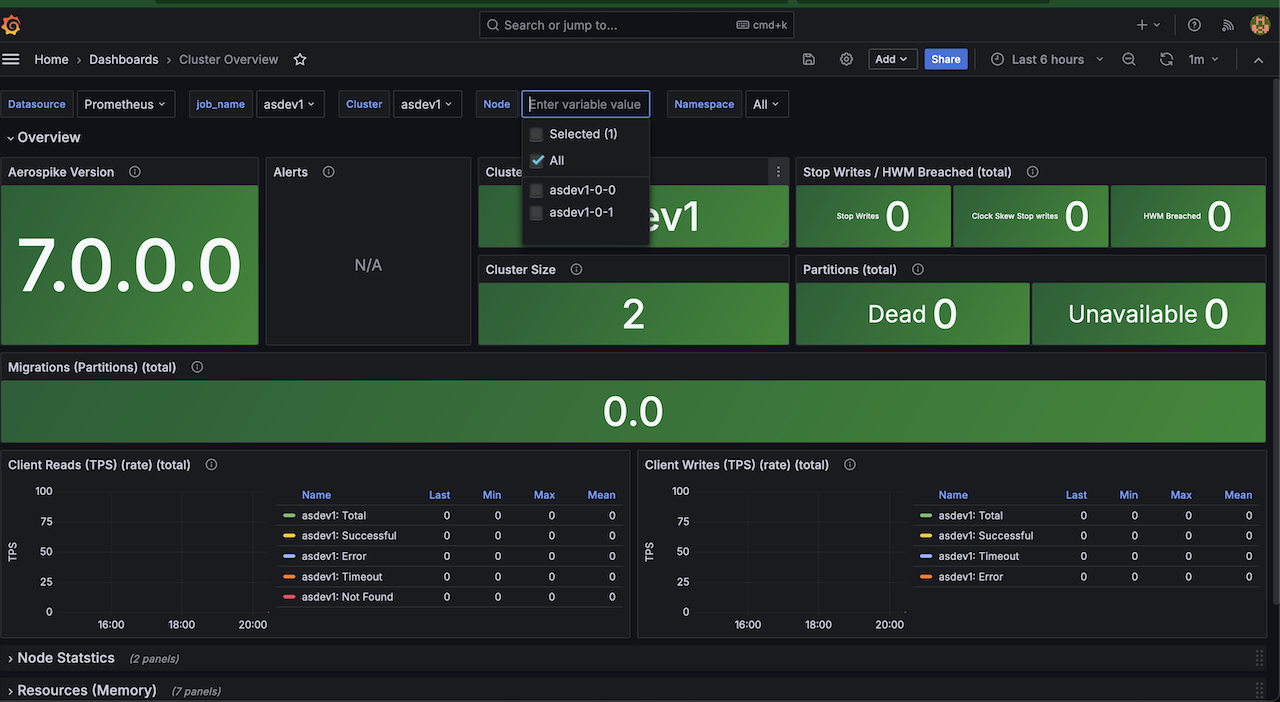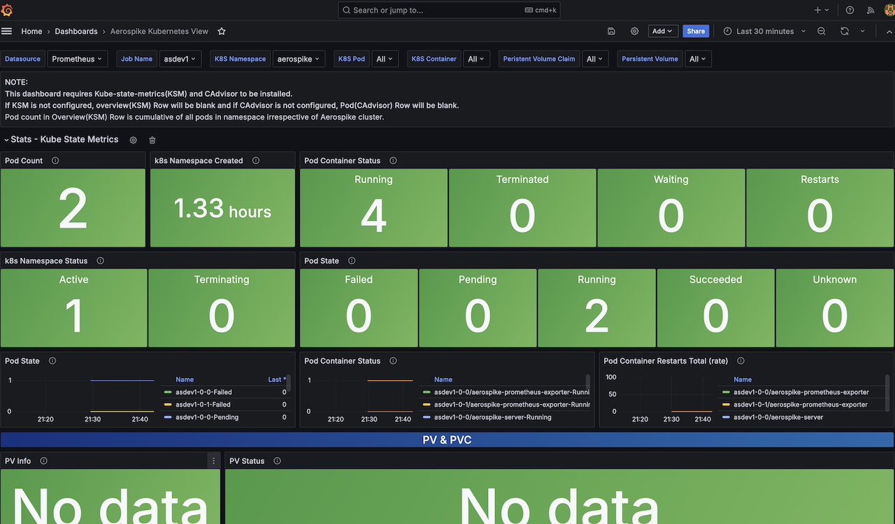 this dashboard helps to view stats of aerospike-server & exporter running in Kubernetes using exporter tools like kube-state-metrics and cadvisor