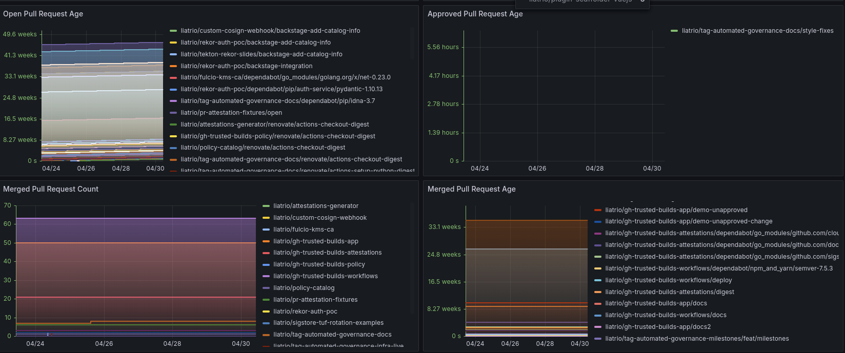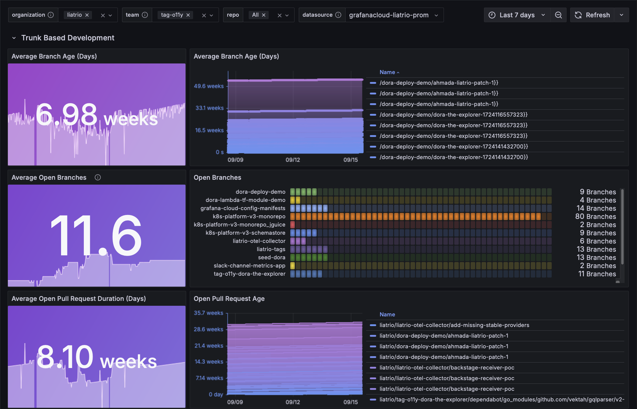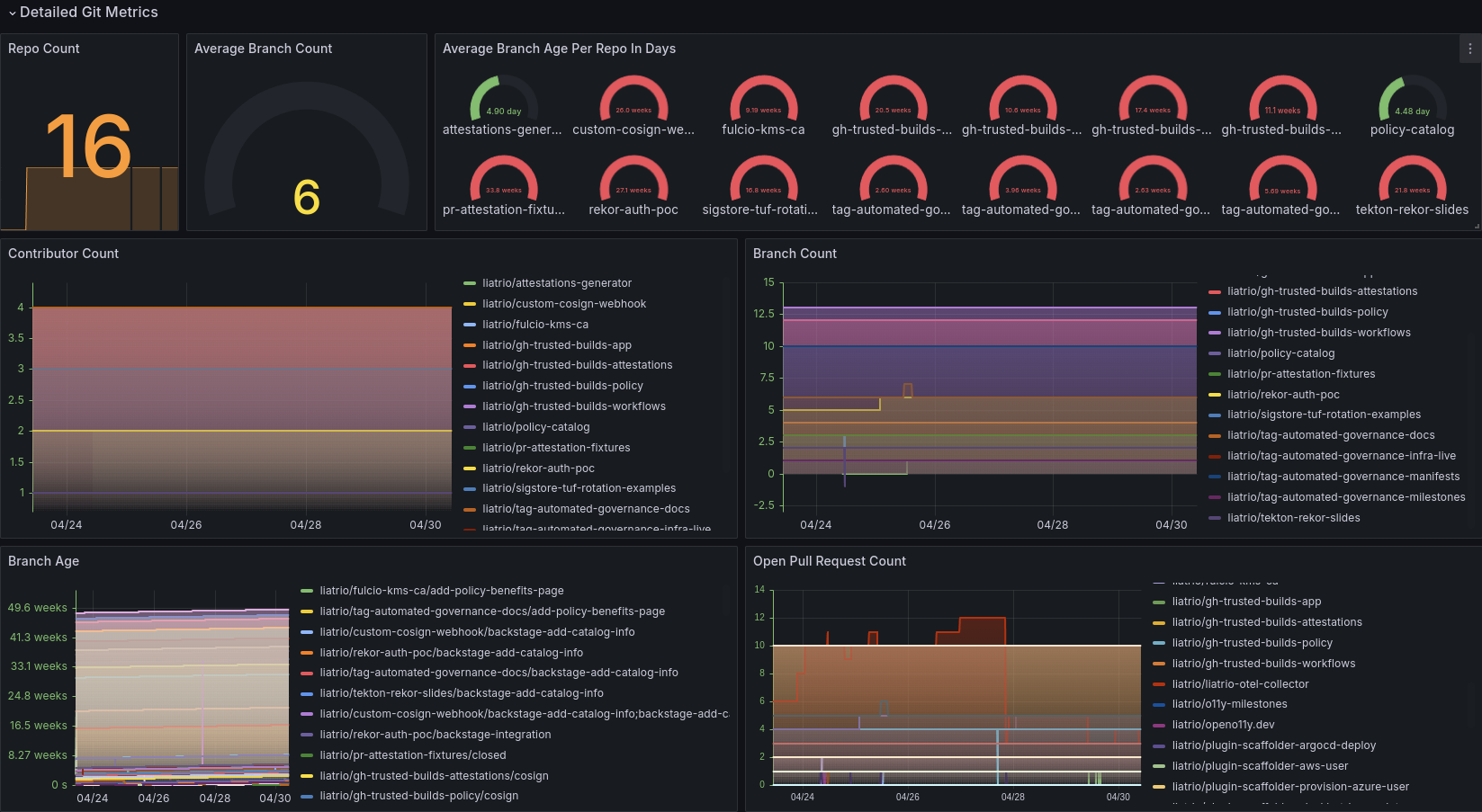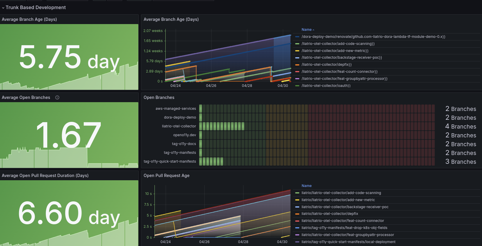 Displays the Trunk Based Development and Small Batch Delivery capabilities with accompanying signals. These metrics are retrieved from the OpenTelemetry GitHub Receiver. The upstream contribution only has GitHub and does not contain security metrics from GHAS. GitLab may can be found in the Liatrio OTEL Collector Distribution.