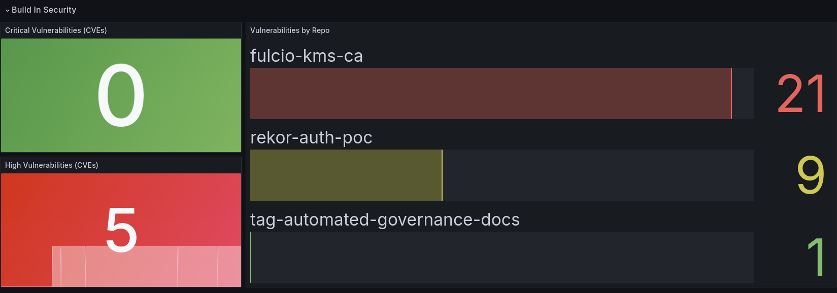 Displays the Trunk Based Development and Pervasive Security capabilities with accompanying signals. These metrics are scraped using the OpenTelemetry GitHub (or soon to come GitLab) Receiver.