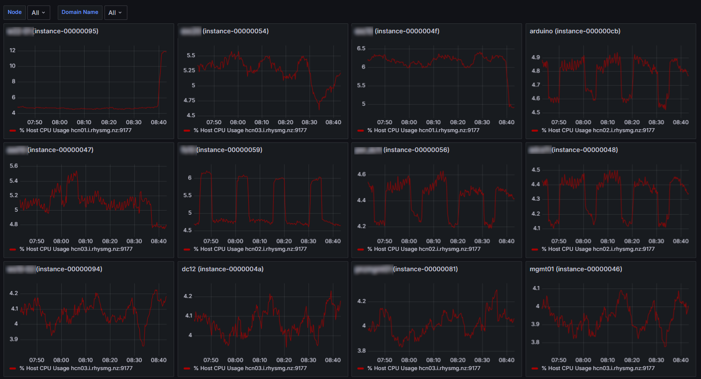 Repeating Individual time series charts showing % of host CPU time for multiple libvirt instances which are being managed by OpenStack Nova