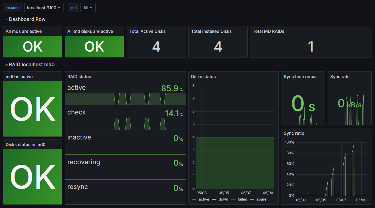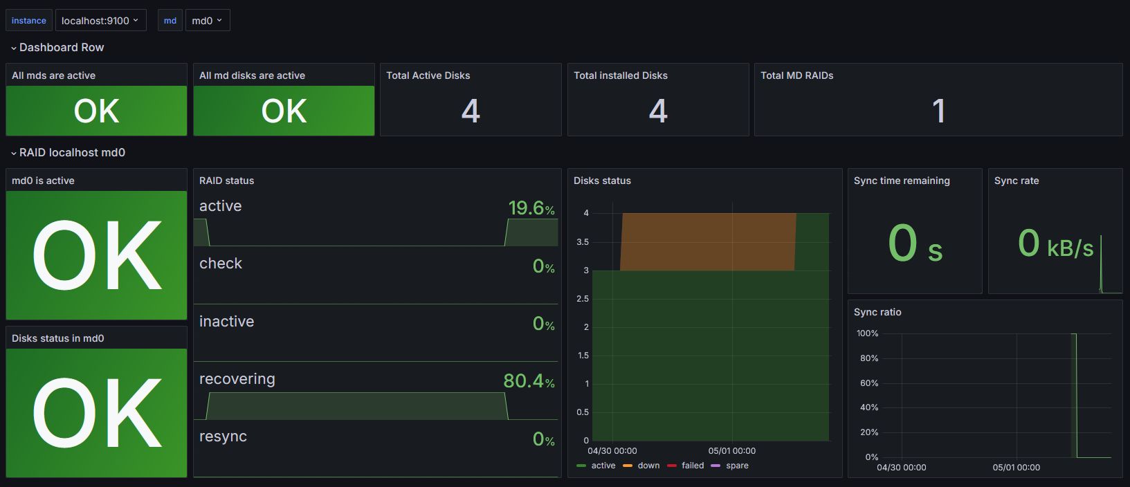 node_md_disks# added{state="down"}node_md_sync_time_remaining(seconds)node_md_blocks_synced_speedUPDATE: renamed tonode_md_sync_time_remaining_secondsnode_md_blocks_synced_pctUPDATE: renamed tonode_md_blocks_synced_percent