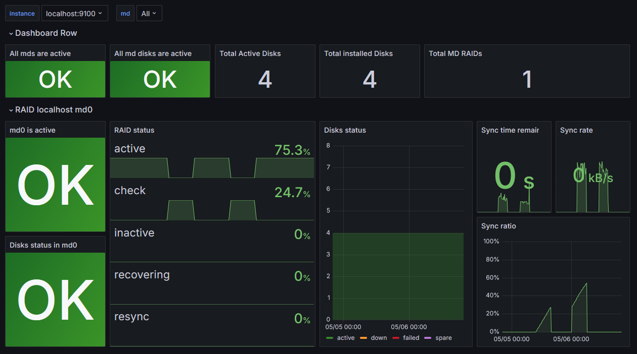 node_md_blocks_synced / node_md_blocksas progress percentage created wrong results on my system, as the total-blocks differed from the total-to-be-synced-blocks. This may be due to the raid-level being used (raid5).