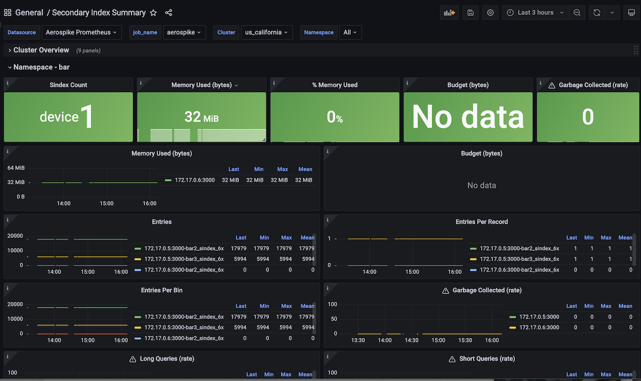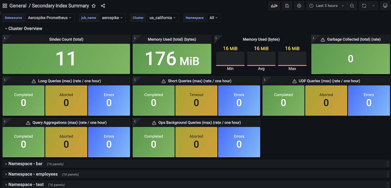 Aerospike Secondary Index Summary View dashboard for Aerospike Monitoring Stack