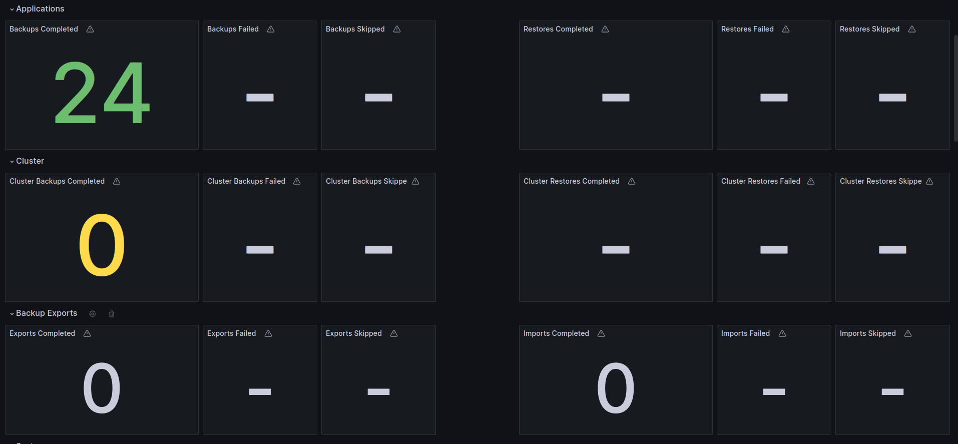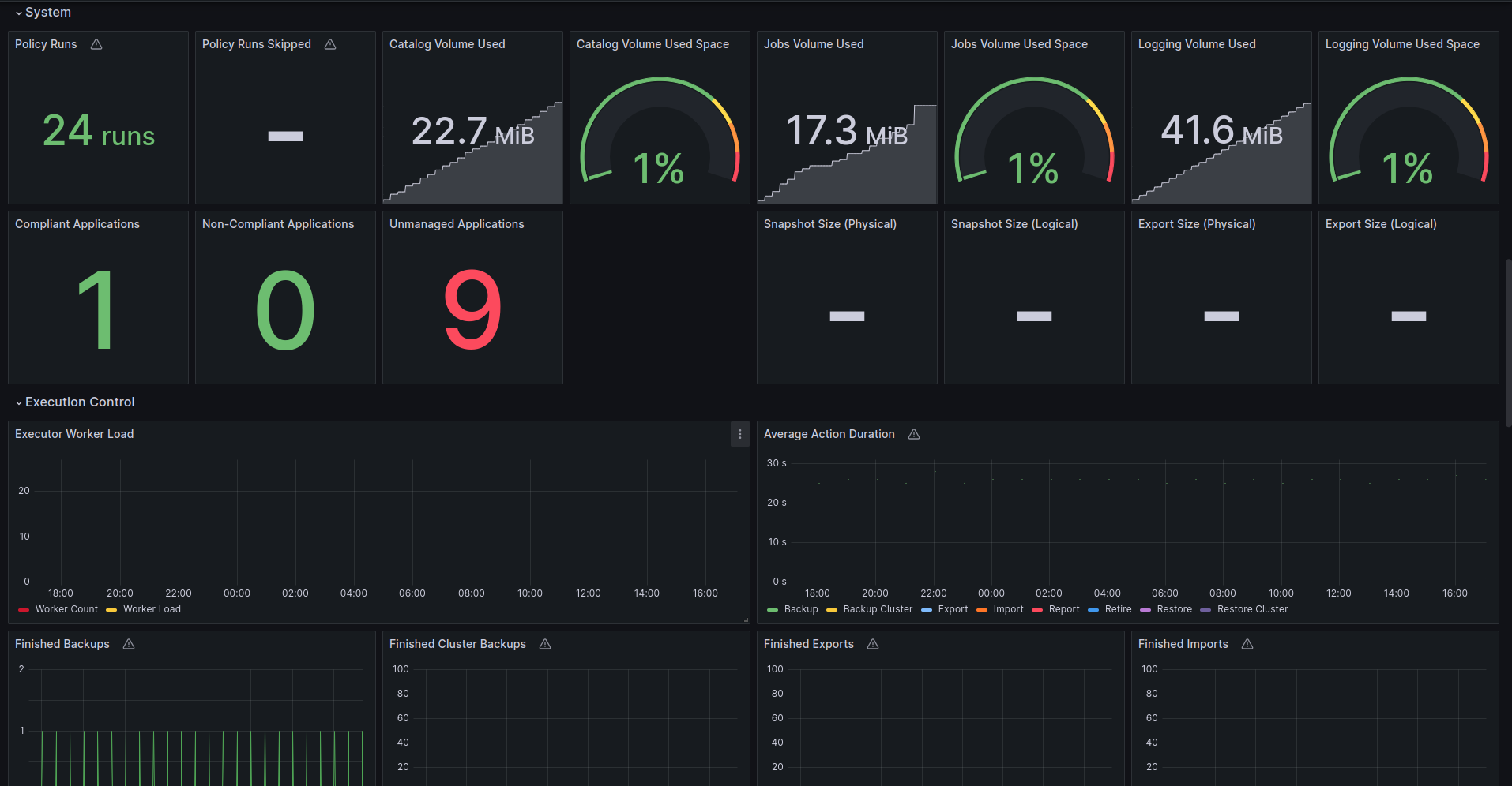 The Veeam Kasten dashboard for Grafana provides visualizations of key operational metrics from the built-in Prometheus server of an individual Kasten instance, including: