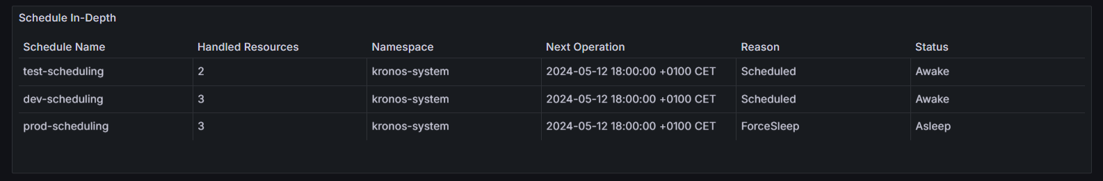 - indepth_schedule_info: Gives detailed insights into the status, reason, next operation, and handled resources for each KronosApp custom resource.