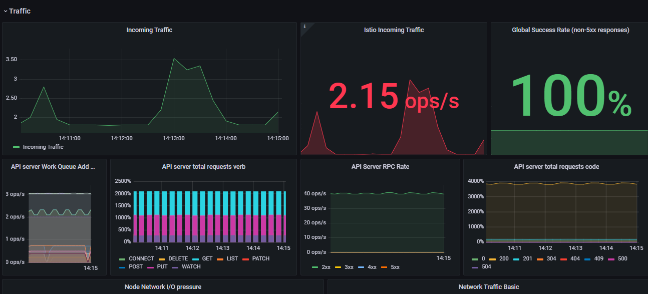 This comprehensive Grafana dashboard provides a detailed view of the key metrics that can be categorized under the Four Golden Signals: Latency, Traffic, Errors, and Saturation. Designed for quick issue identification, this dashboard offers real-time insights into the performance and health of your Kubernetes cluster. Ideal for DevOps teams and SREs, this dashboard is your go-to resource for proactive Kubernetes cluster management.