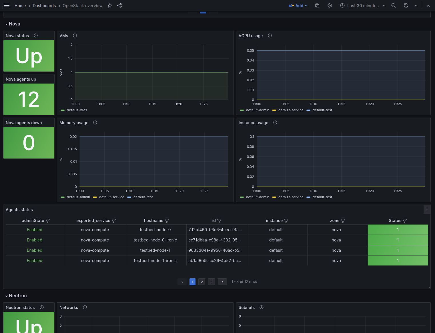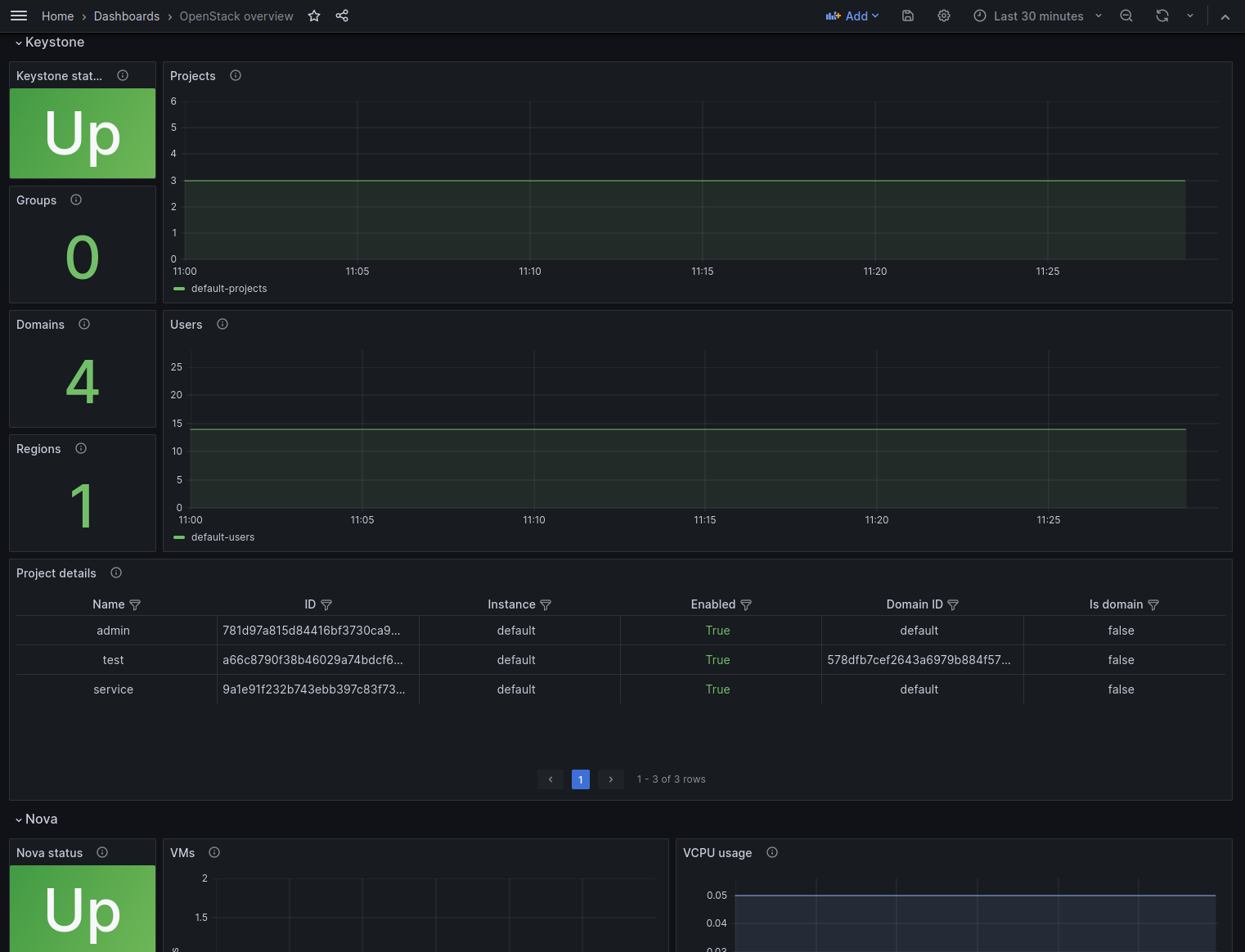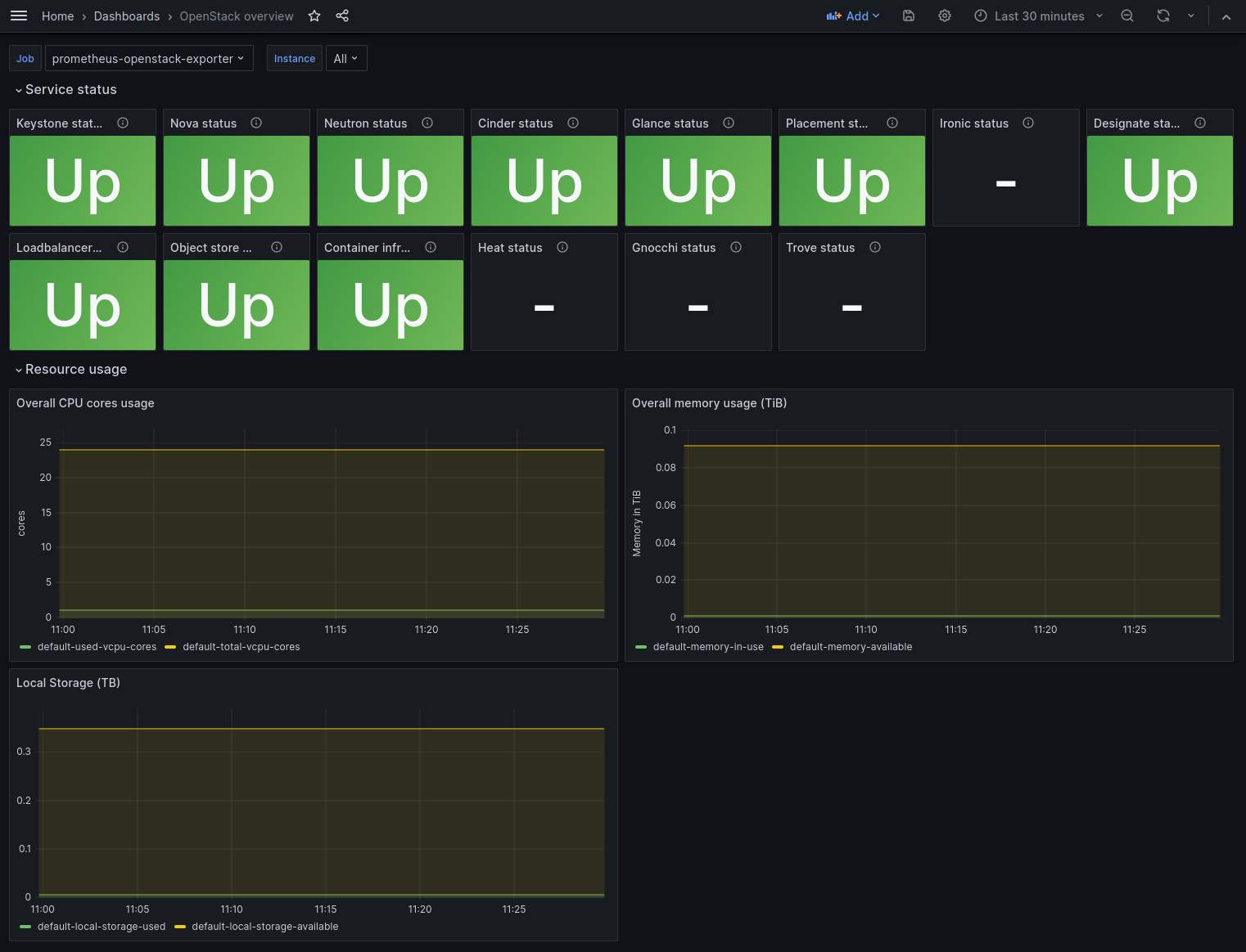 A dashboard designed to visualize metrics collected from an OpenStack cloud through the exporter found at https://github.com/openstack-exporter/openstack-exporter