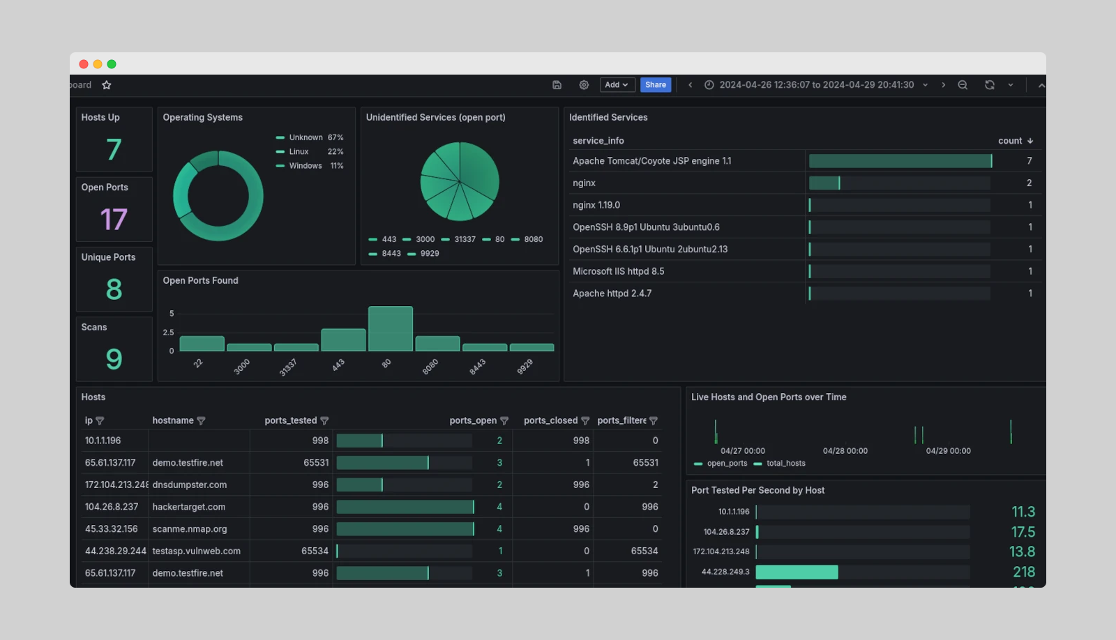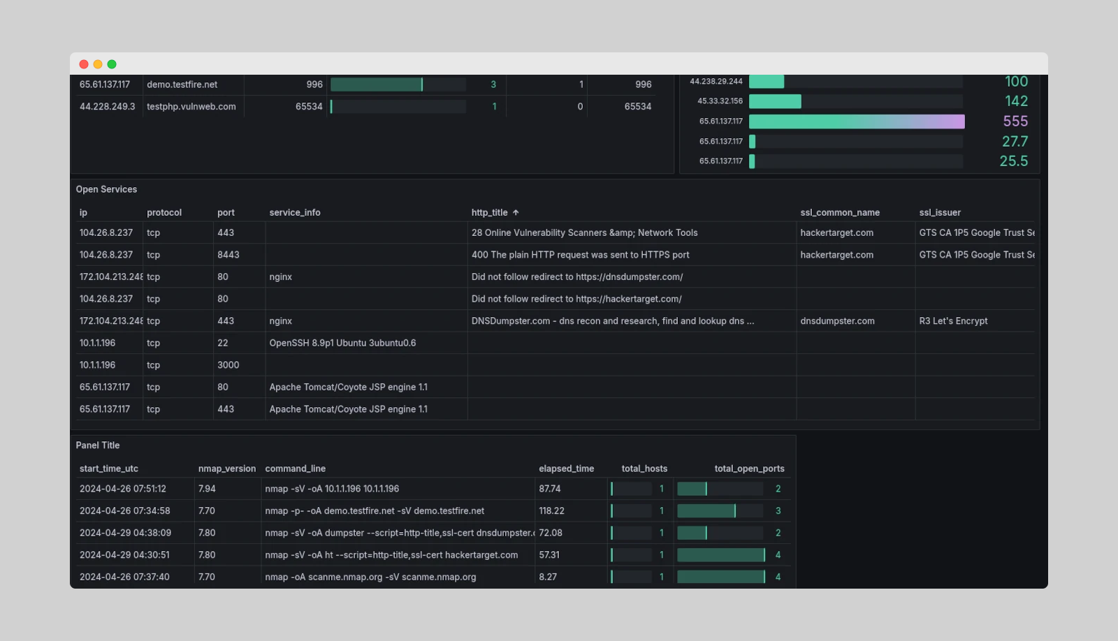 With a visual representation of the Nmap XML data we can get an overview of the network and open services. Customise the dashboard to your specific use case and extend as required.
