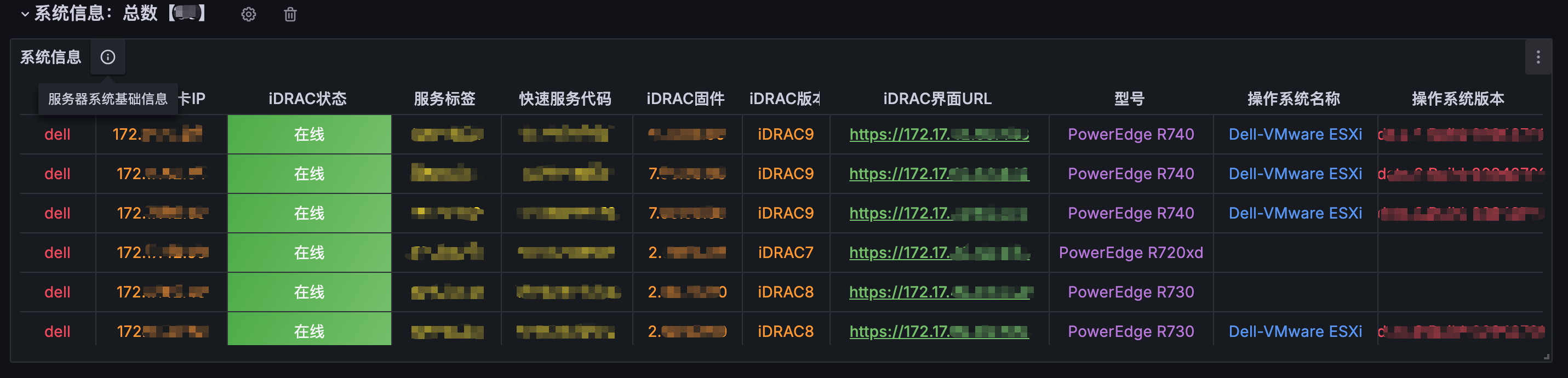 iDRAC URL,可直接在面板中点击链接登录iDRAC - 对应物理服务器全局状态信息可根据模版变量选择主机IP实现对物理机全局状态的查看