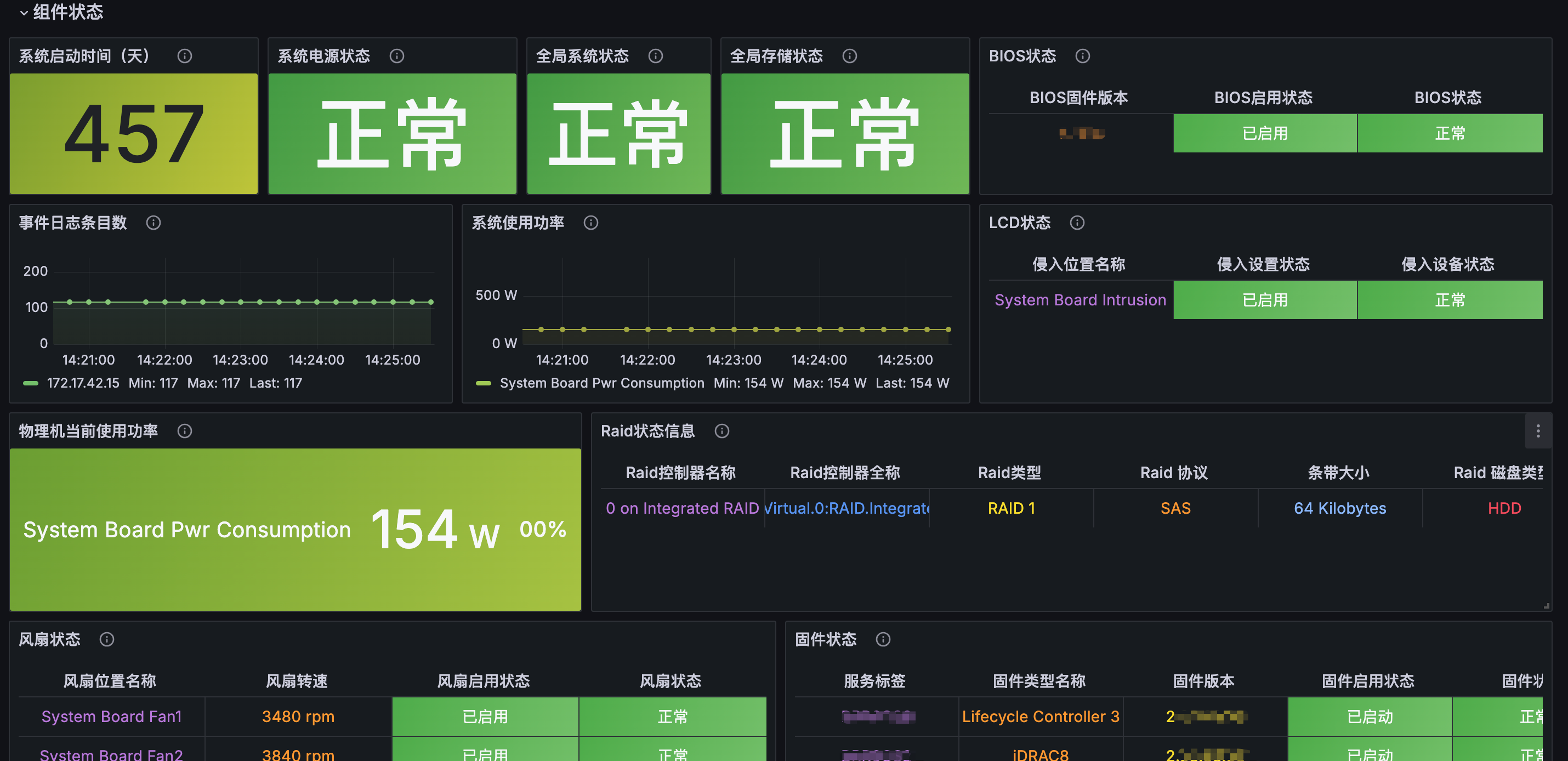 基于 SNMP 协议的监控戴尔物理机 iDRAC 信息的 Grafana 面板。