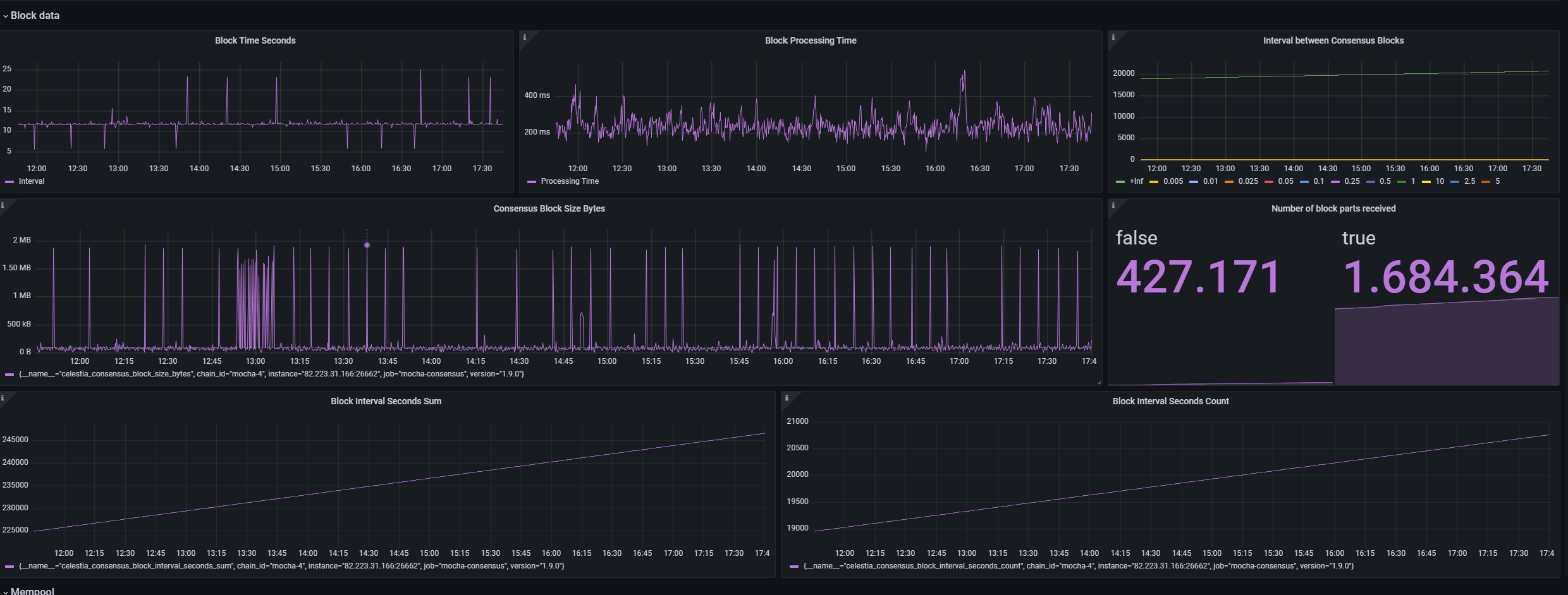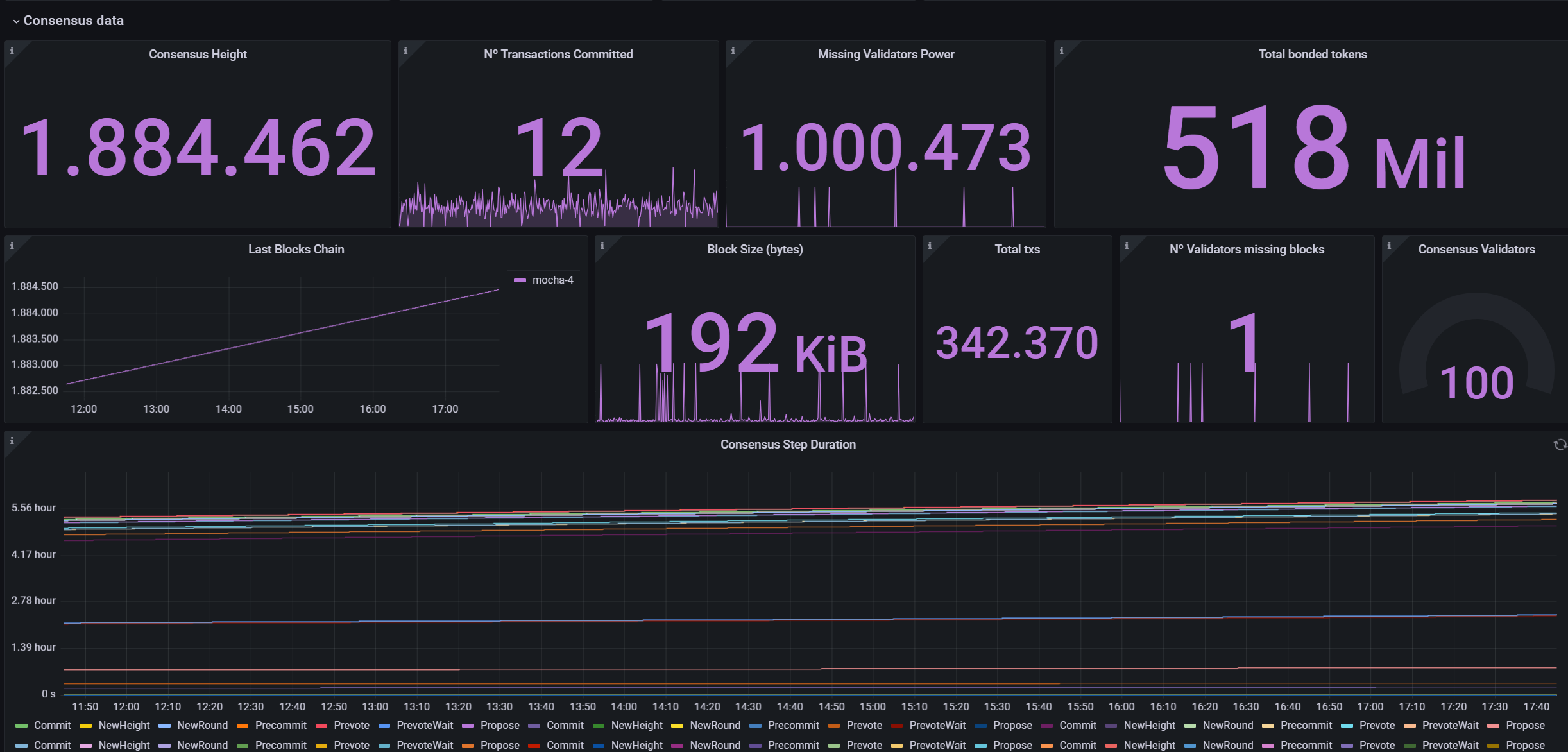 This Grafana dashboard provides a comprehensive and detailed view of the state and activity of nodes within the Celestia consensus system, allowing network administrators and developers to monitor various critical aspects of the infrastructure in real time. The interface is designed to facilitate the tracking of node synchronization performance and efficiency, as well as the participation and voting power of validators within the network. Through this panel, users can quickly identify potential issues or confirm the proper functioning of the system, ensuring optimal operation and network security for Celestia's blockchain. This resource is essential for maintaining transparency and effectiveness in upholding the integrity of the blockchain.