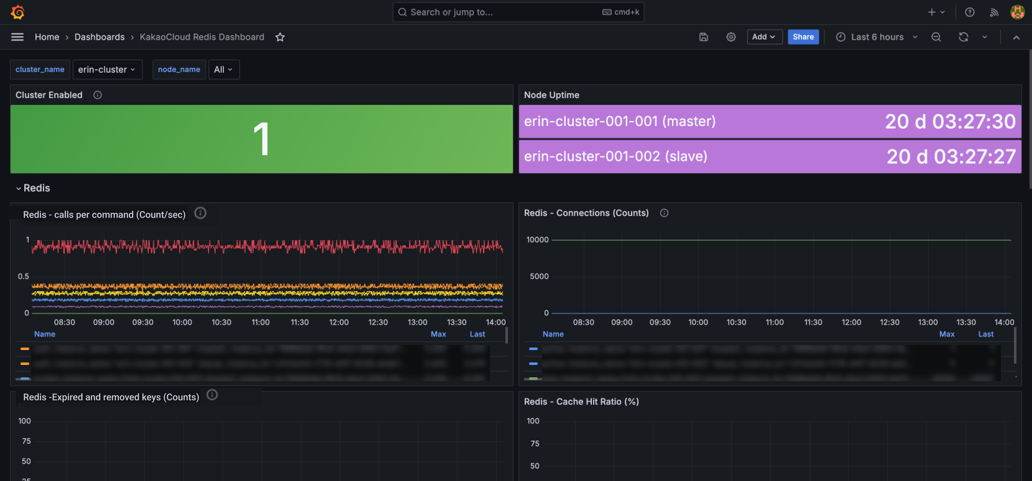 The KakaoCloud Redis Dashboard uses the Prometheus data source to create a Grafana dashboard with the stat and time-series panels.