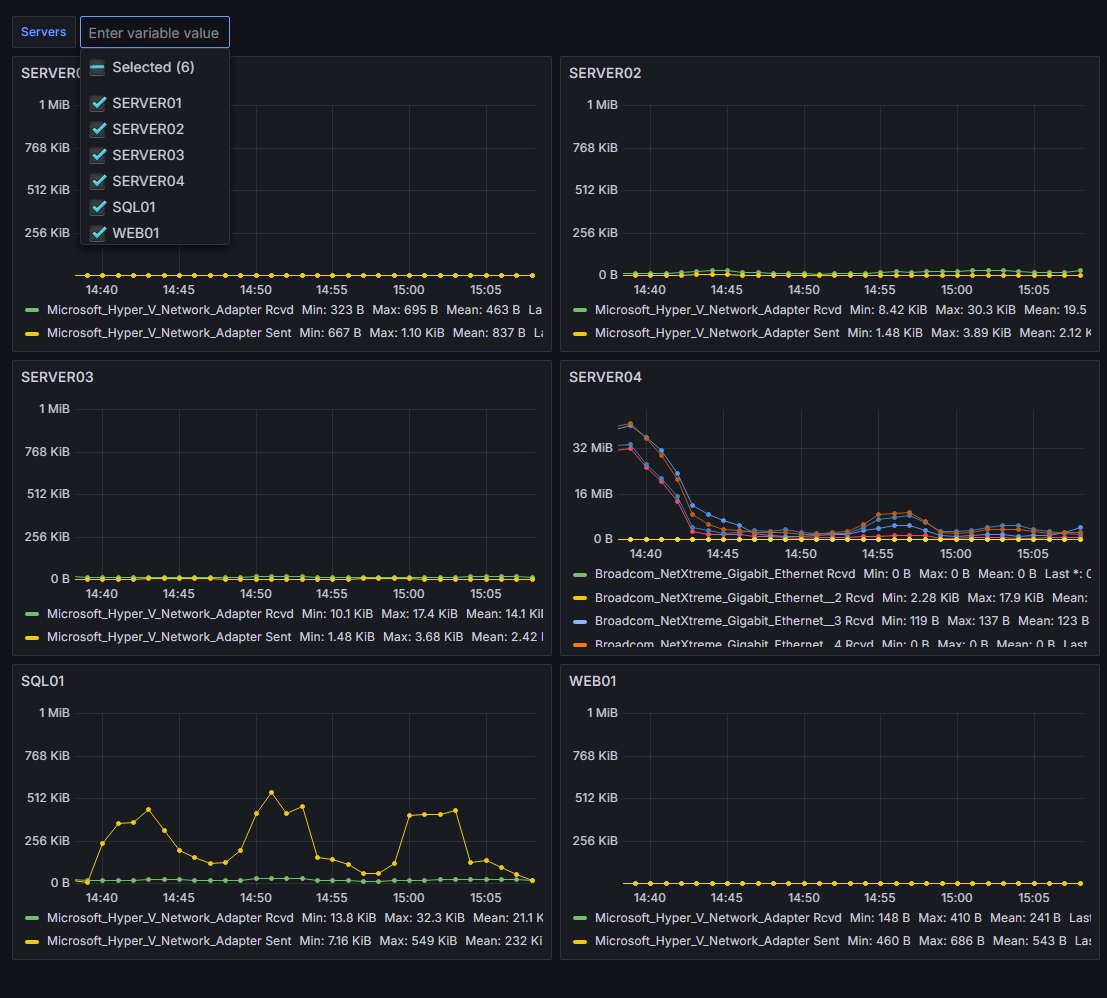 This dashboard shows the network bandwidth used by the Windows servers in a Prometheus data source. Metrics are collected using windows_exporter. Any number of servers can be selected, and all the graphs display on one page.