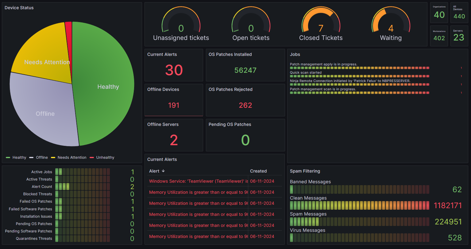 Overall Monitoring Dashboard for the Ninja One RMM. Includes SpamTitan statistics panel, can remove if you don't need it.