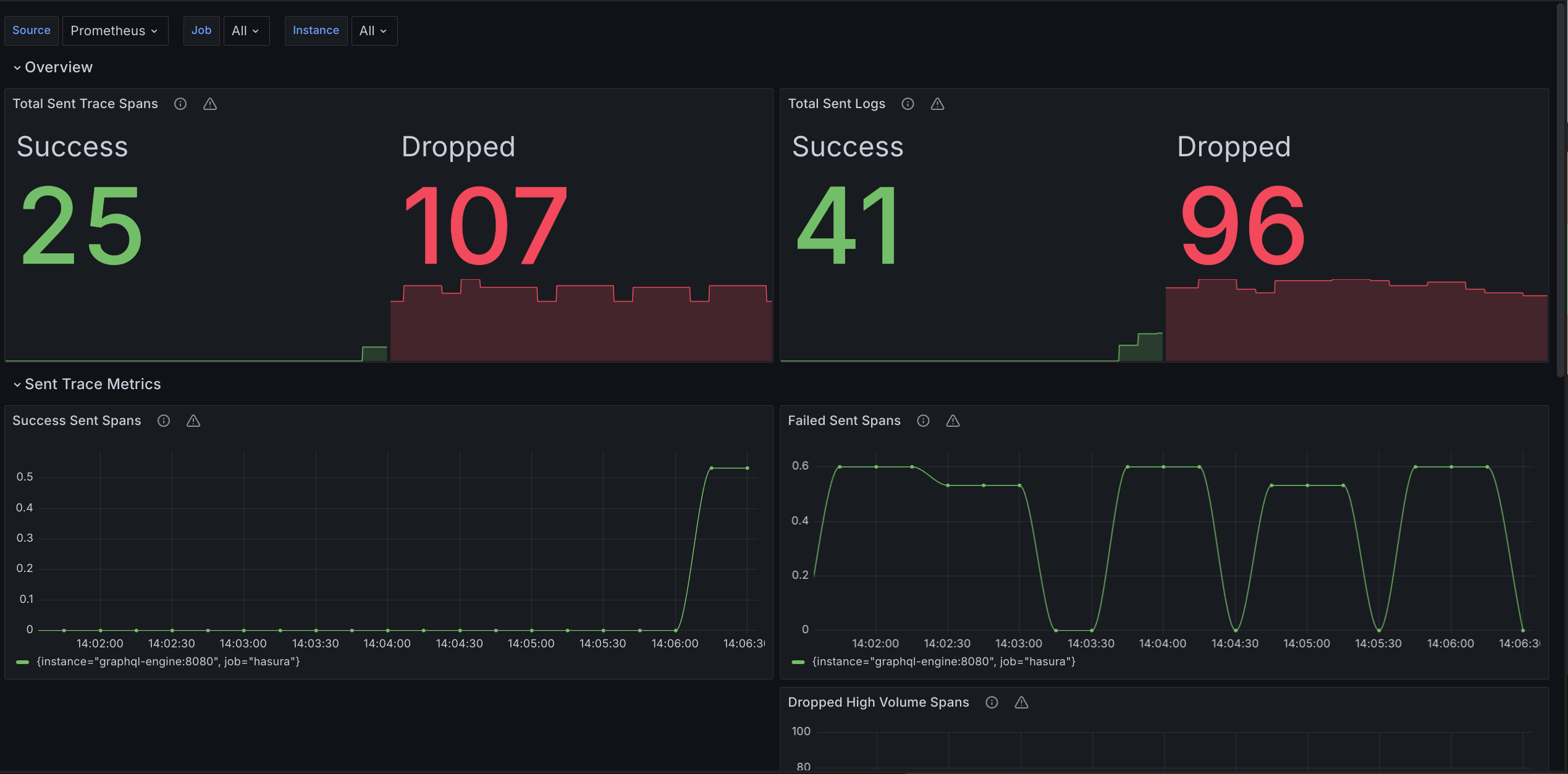 The dashboard visualizes Prometheus metrics of OpenTelemetry reliability that are emitted from Hasura GraphQL Engine Enterprise Edition. See Prometheus Integration with Hasura EE for more information.