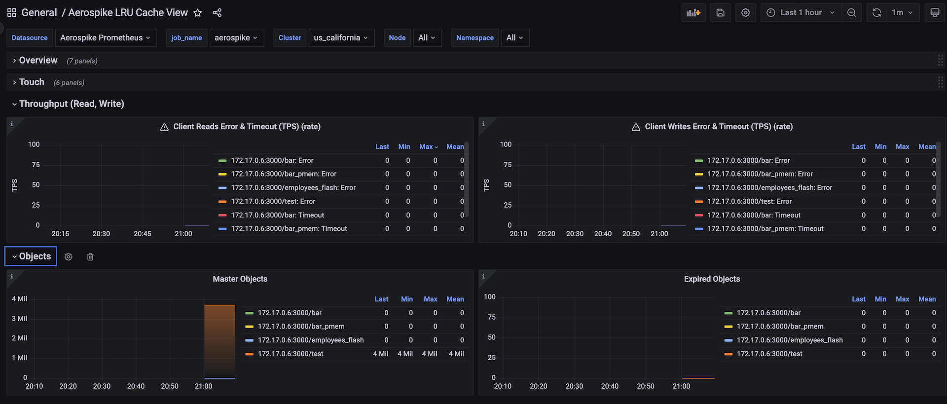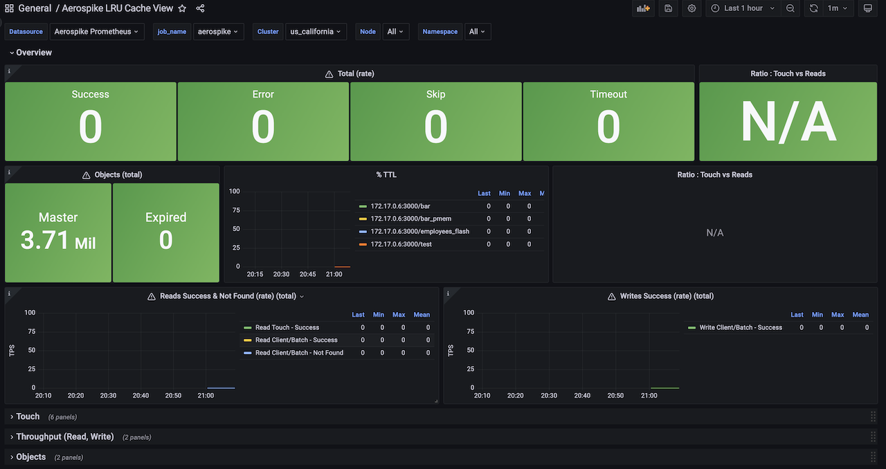 a usecase dashboard, to view various key metrics useful while using aerospike as a distributed cache, dashboard displays key metrics like read_success, errors, timeouts etc.,