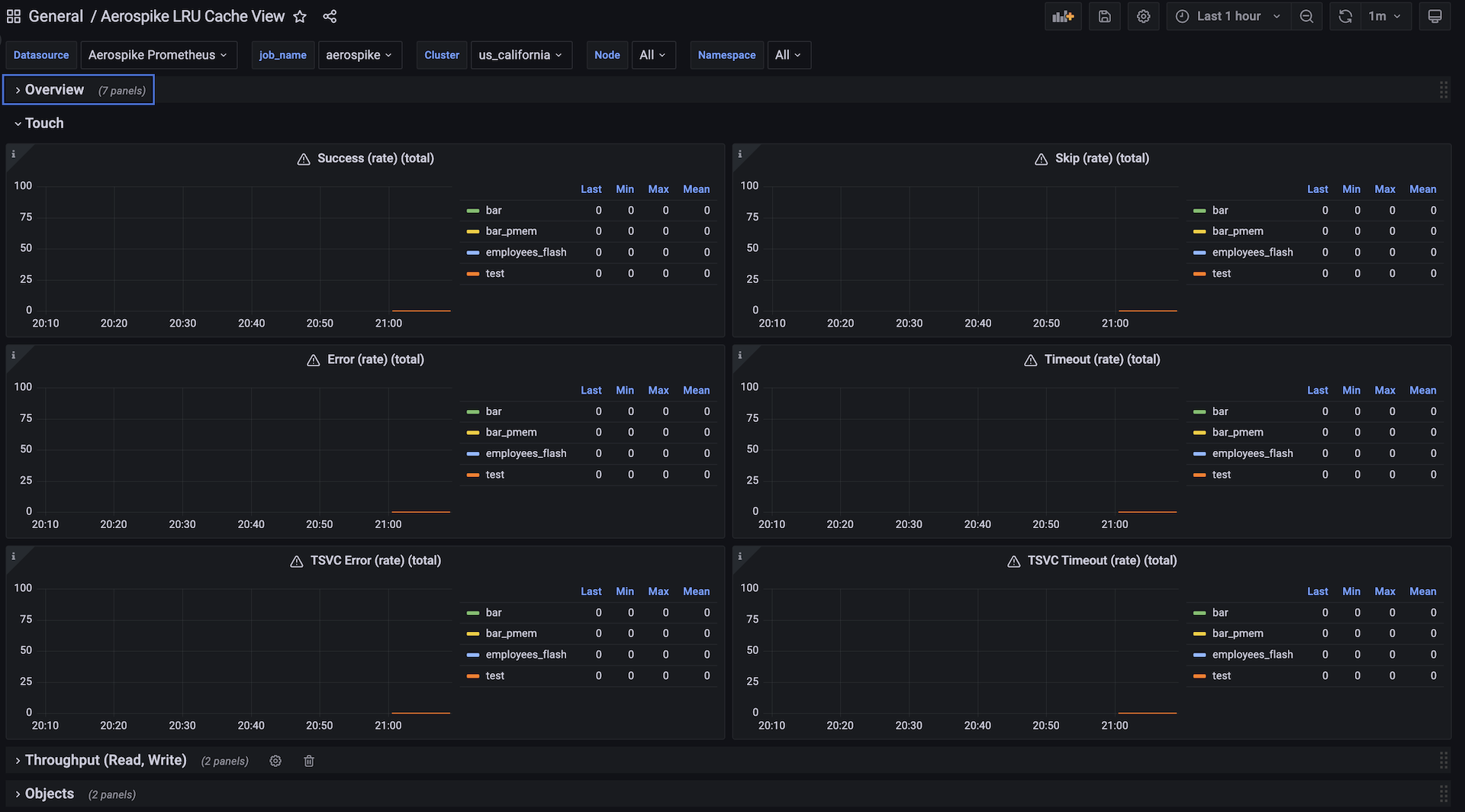 This dashboard covers key read related metrics to be monitored while using Aerospike as a distributed cache