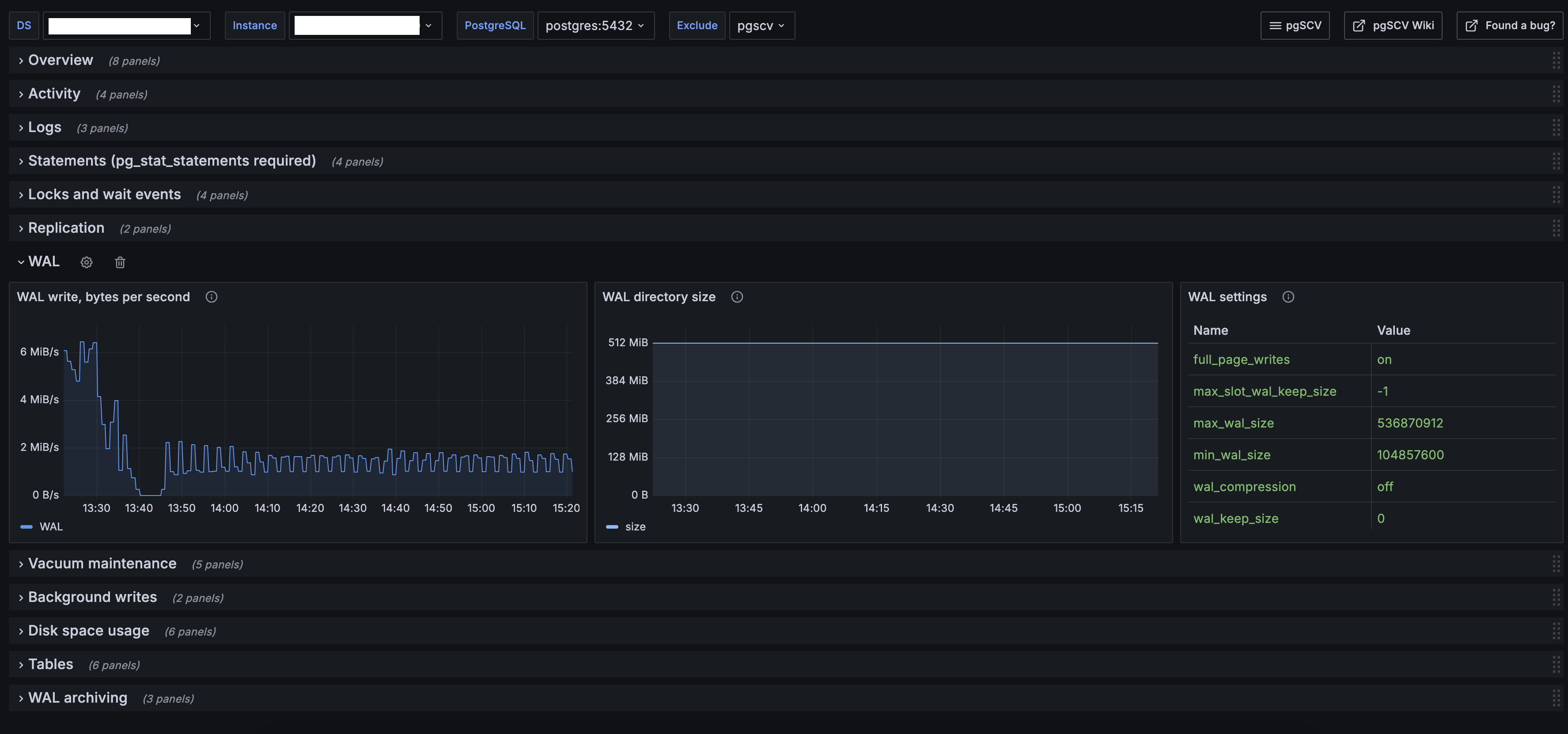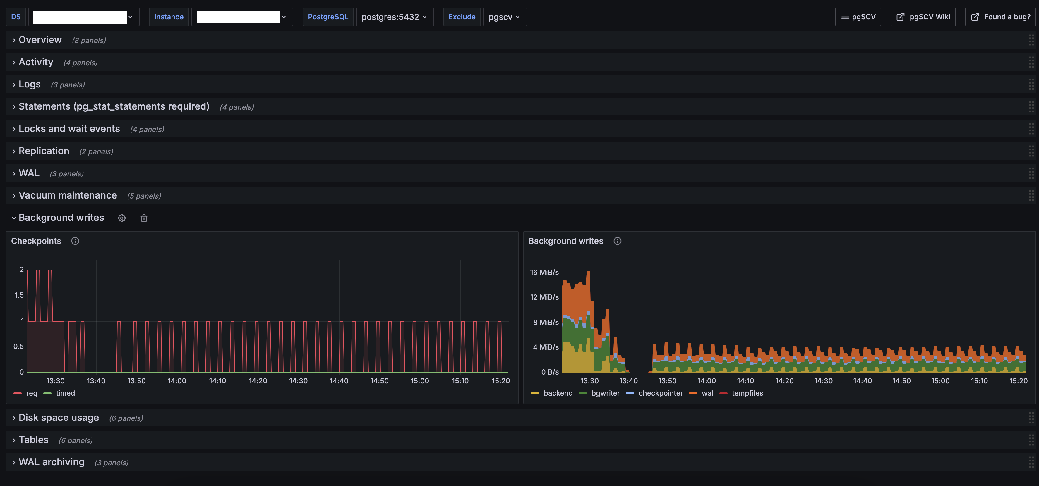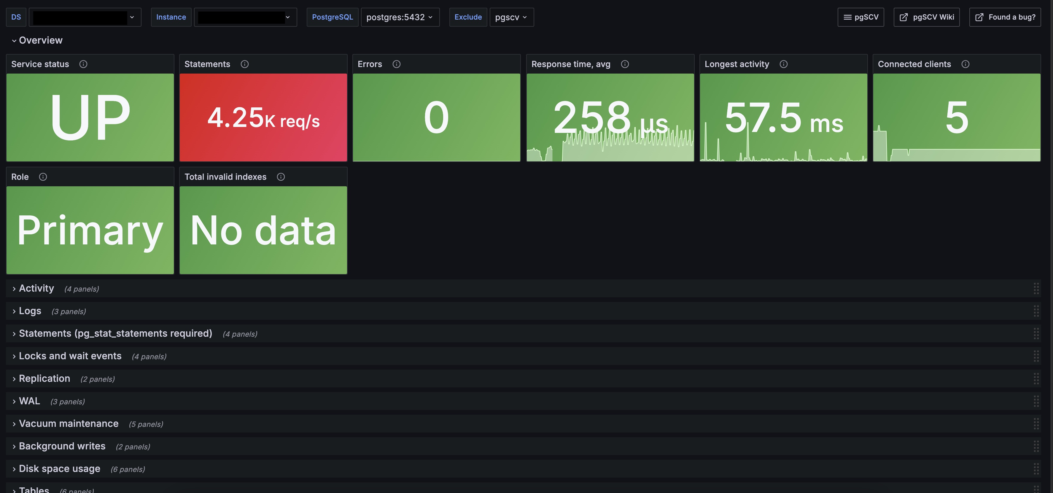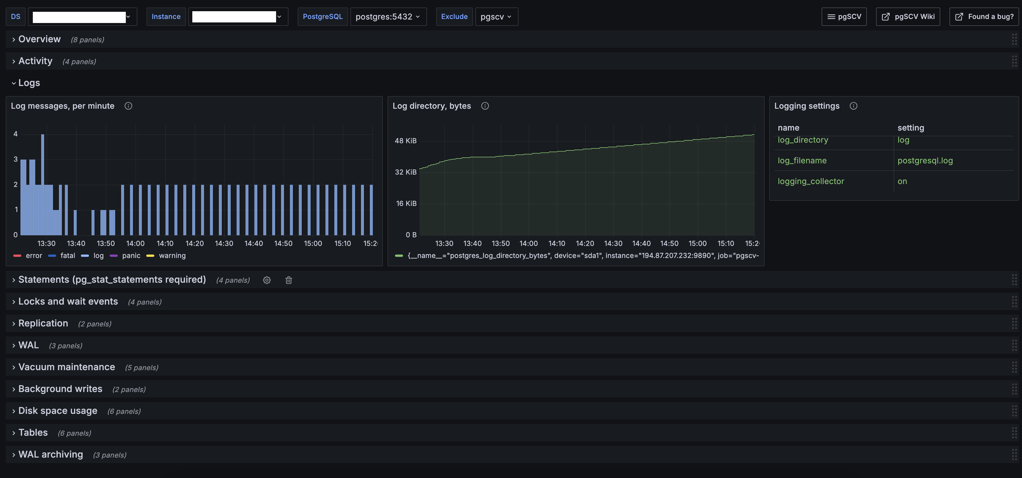 pgSCV’s PostgreSQL dashboard provides charts based on pgSCV PostgreSQL metrics - actvity, statements, logs, tables workload, replication, WAL, autovacuum background services and more.