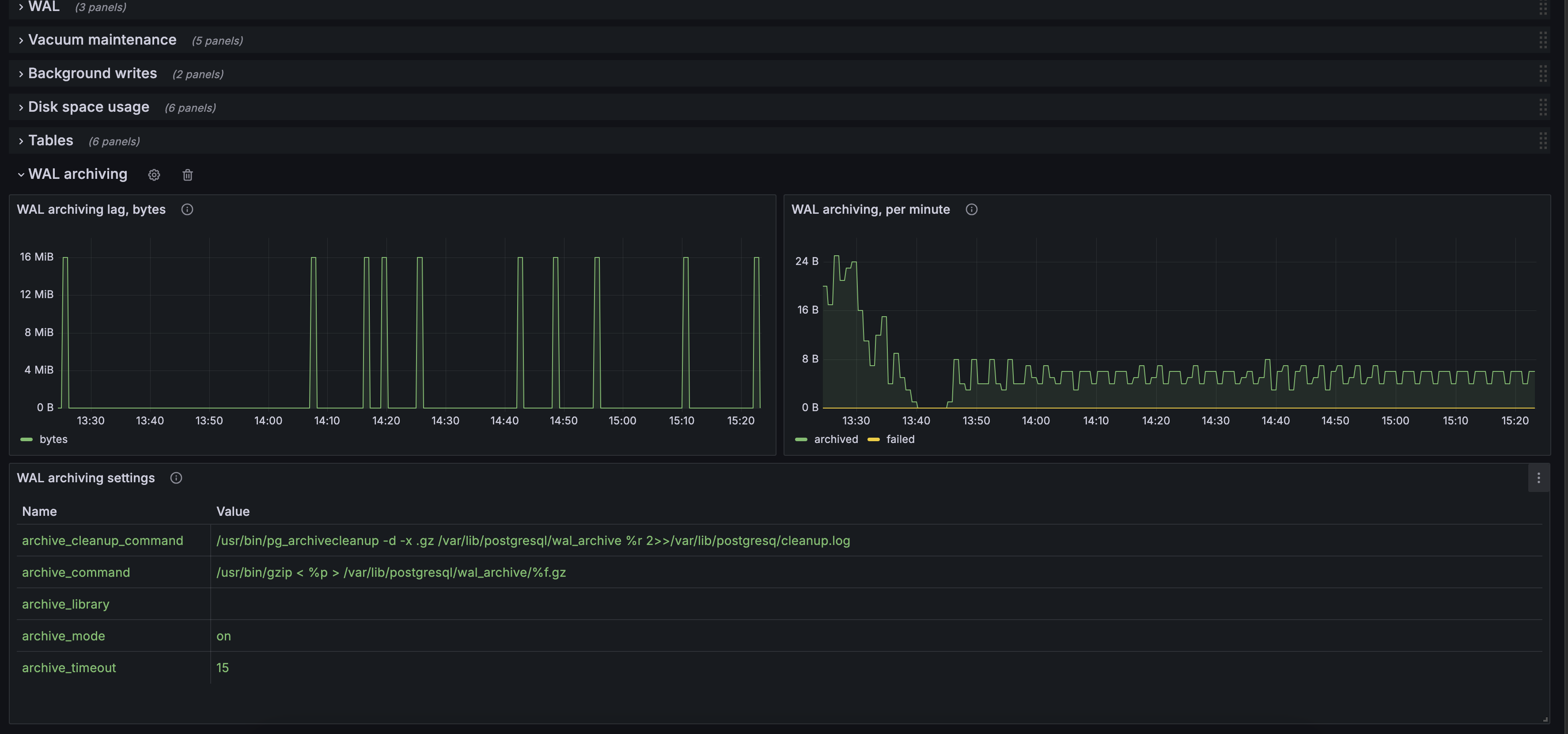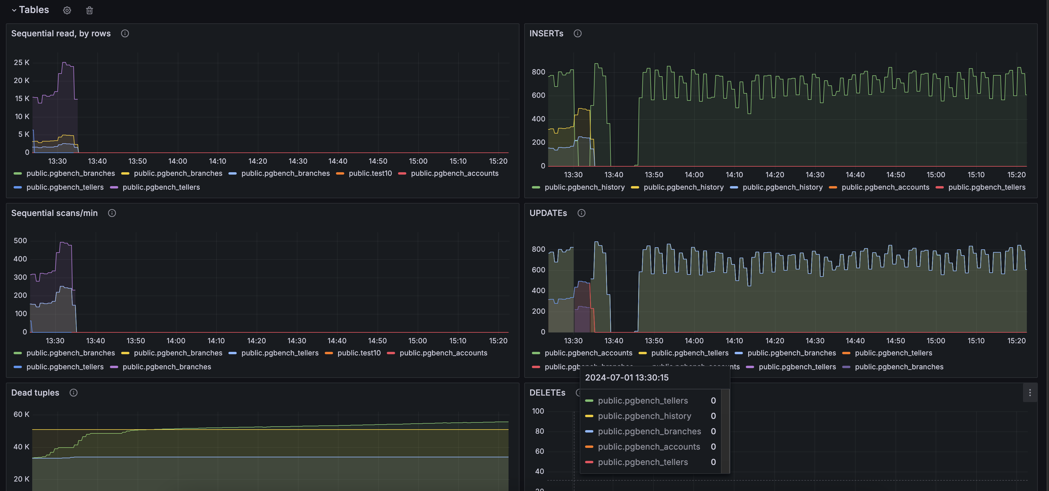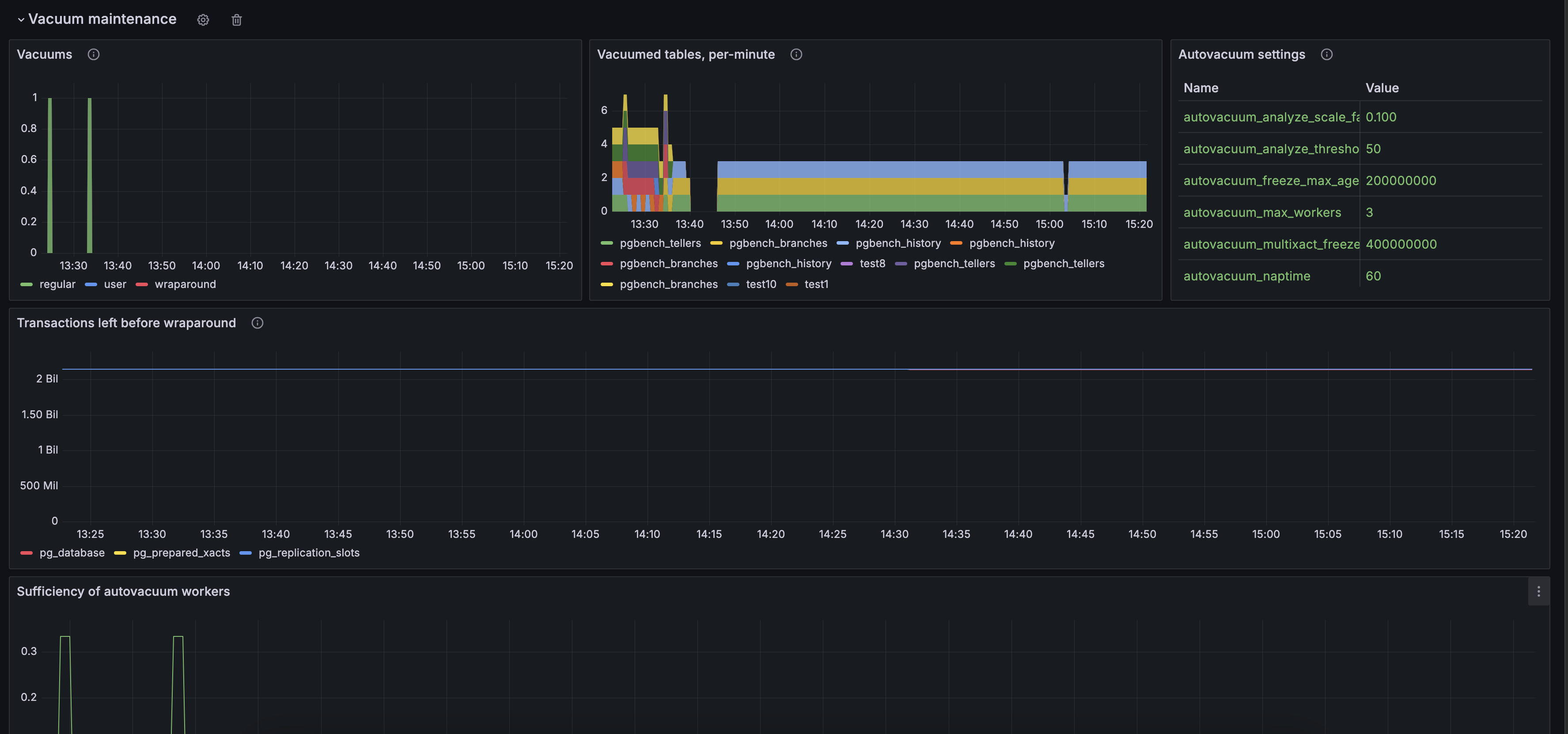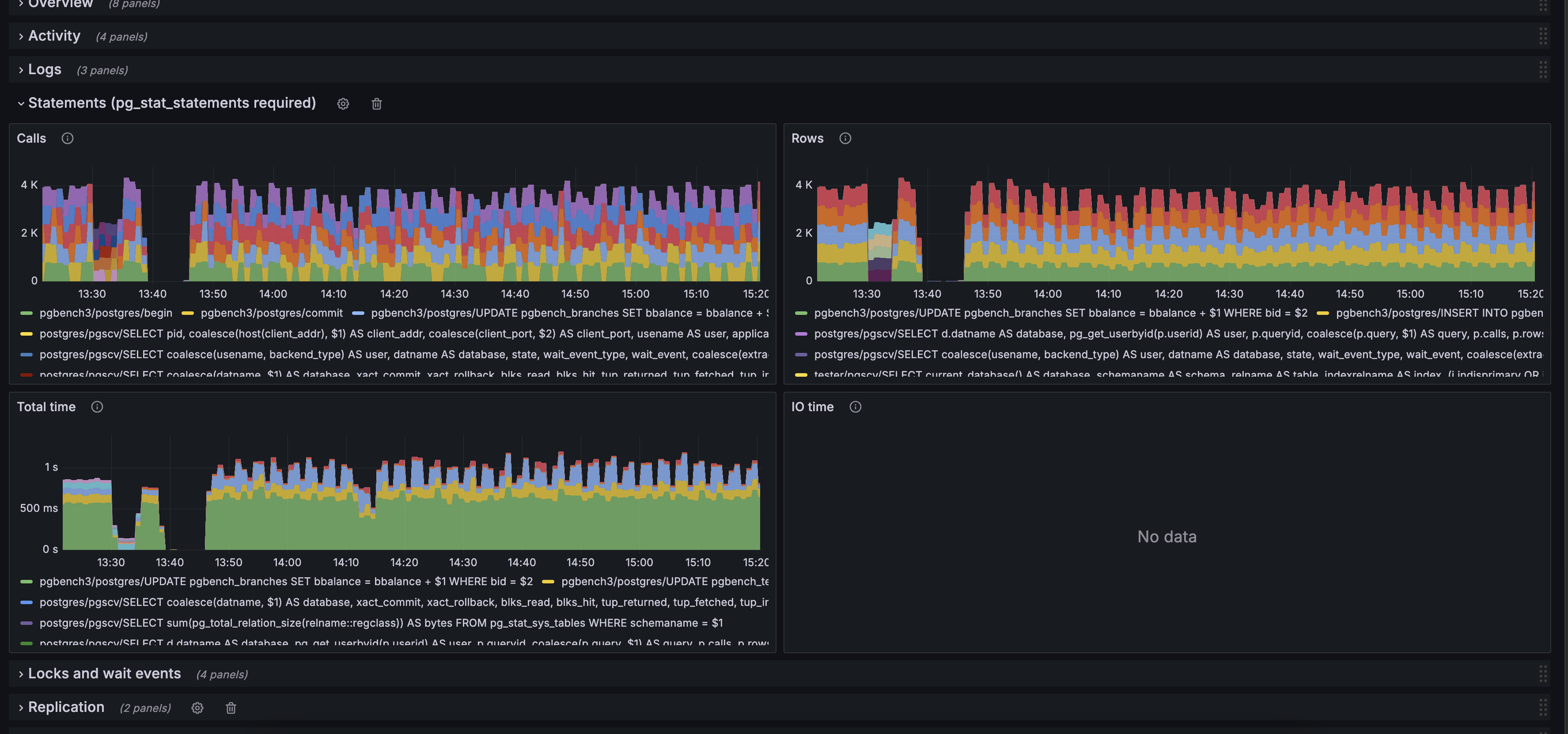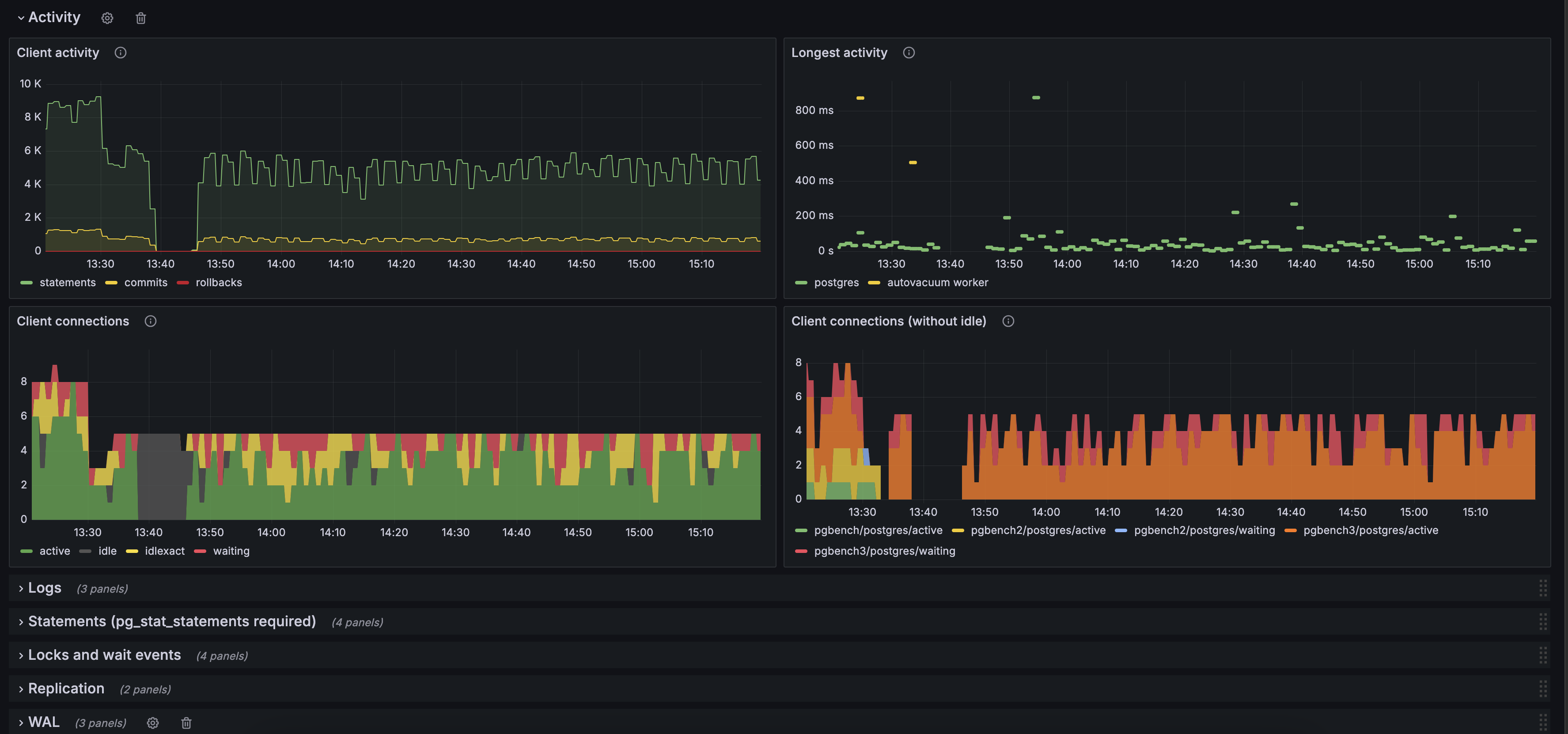 pgSCV’s PostgreSQL dashboard provides charts based on pgSCV PostgreSQL metrics - actvity, statements, logs, tables workload, replication, WAL, autovacuum background services and more.
