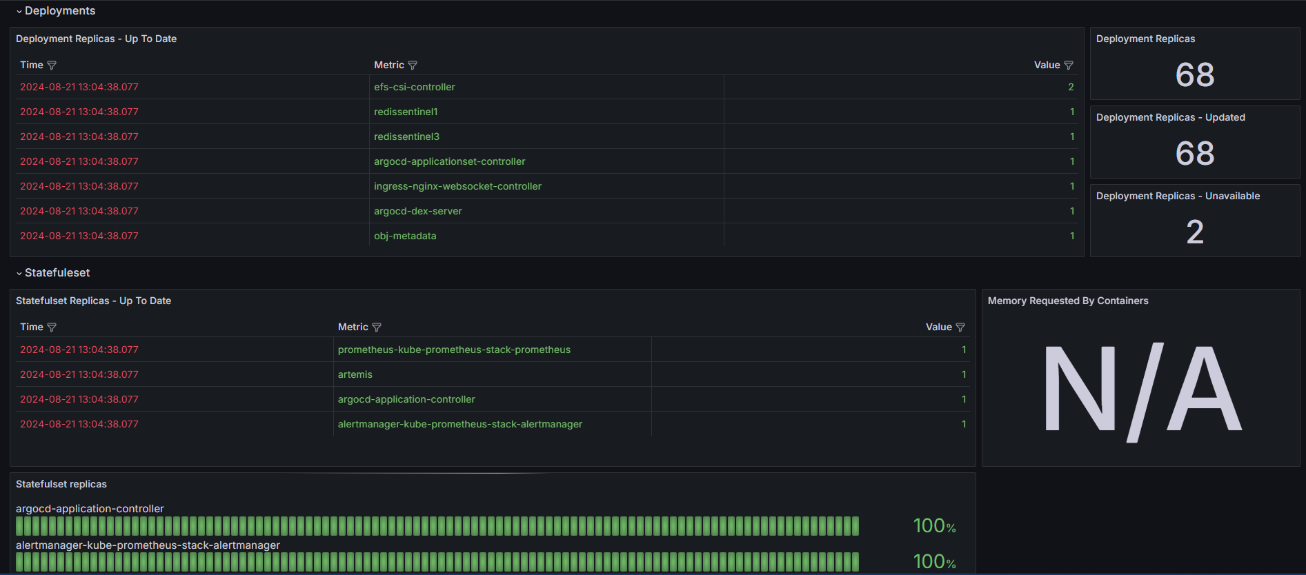 Deployments/StatefulSets Count and Availability: This section displays the count of deployments and statefulsets along with their availability status, helping you monitor the health and readiness of your critical workloads.