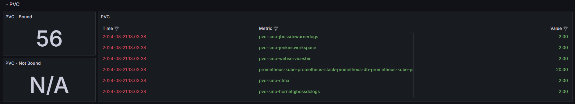 Persistent Volume Claims (PVC) Bound/Not Bound: This section displays the number of PVCs that are bound or not bound, helping you monitor the status of your storage resources and ensure that they are being correctly allocated and utilized.