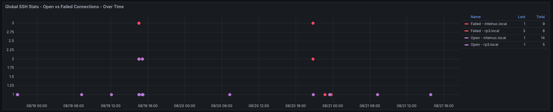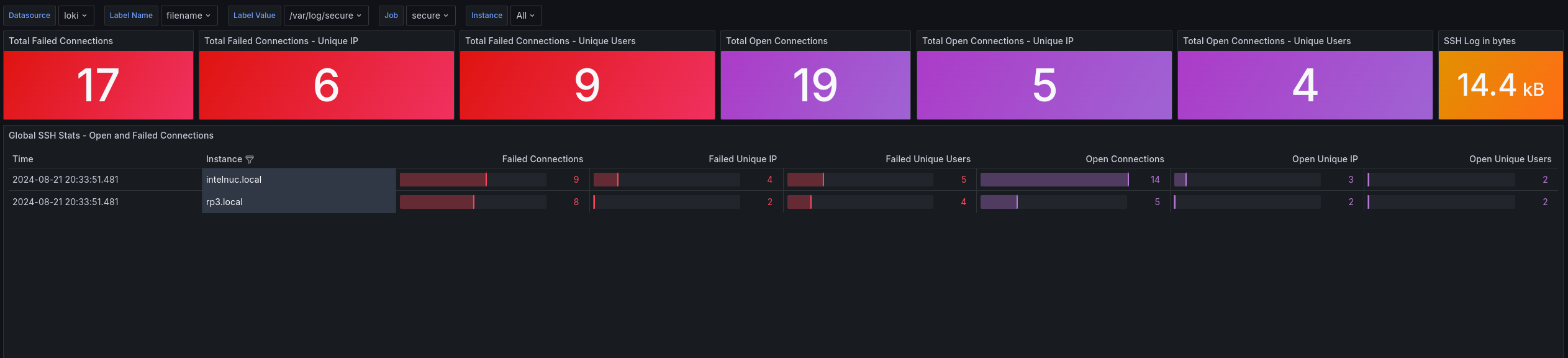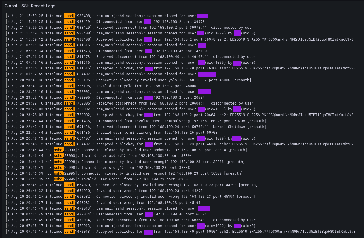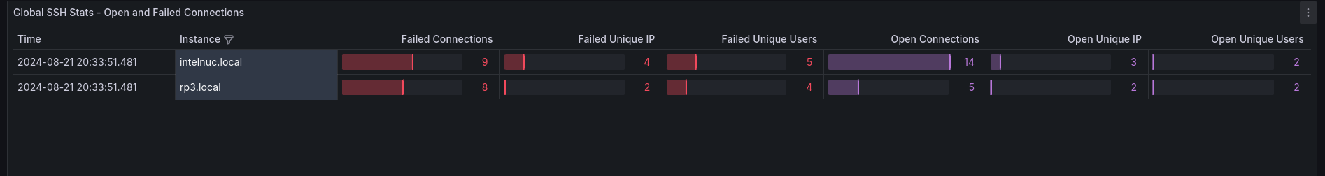 Global SSH visualization provides a comprehensive overview of all your Linux systems in a single view. This view groups SSH connection events, both successful and failed, across all your hosts using Promtail and Loki:
