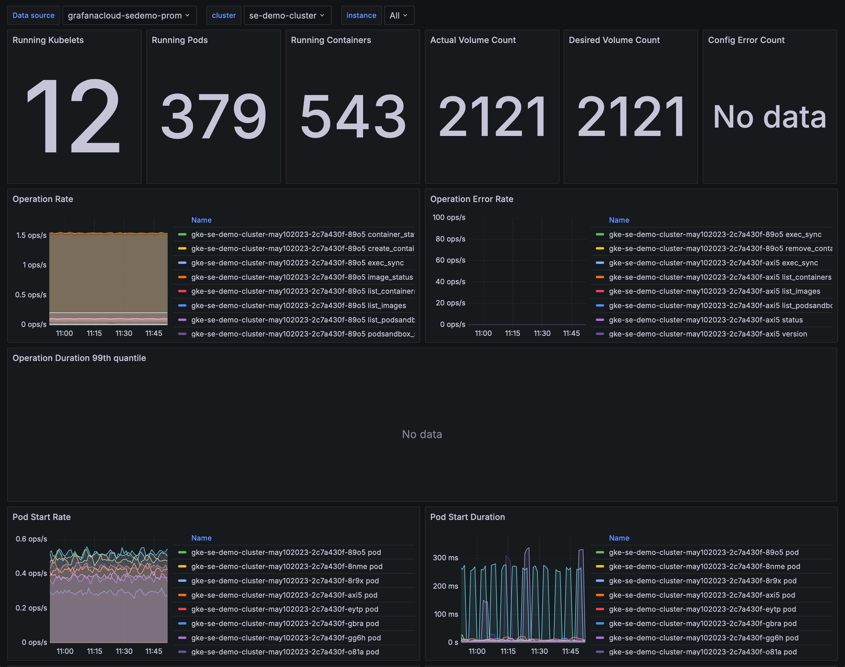 The Kubernetes / Kubelet dashboard uses the prometheus data source to create a Grafana dashboard with the stat and timeseries panels.