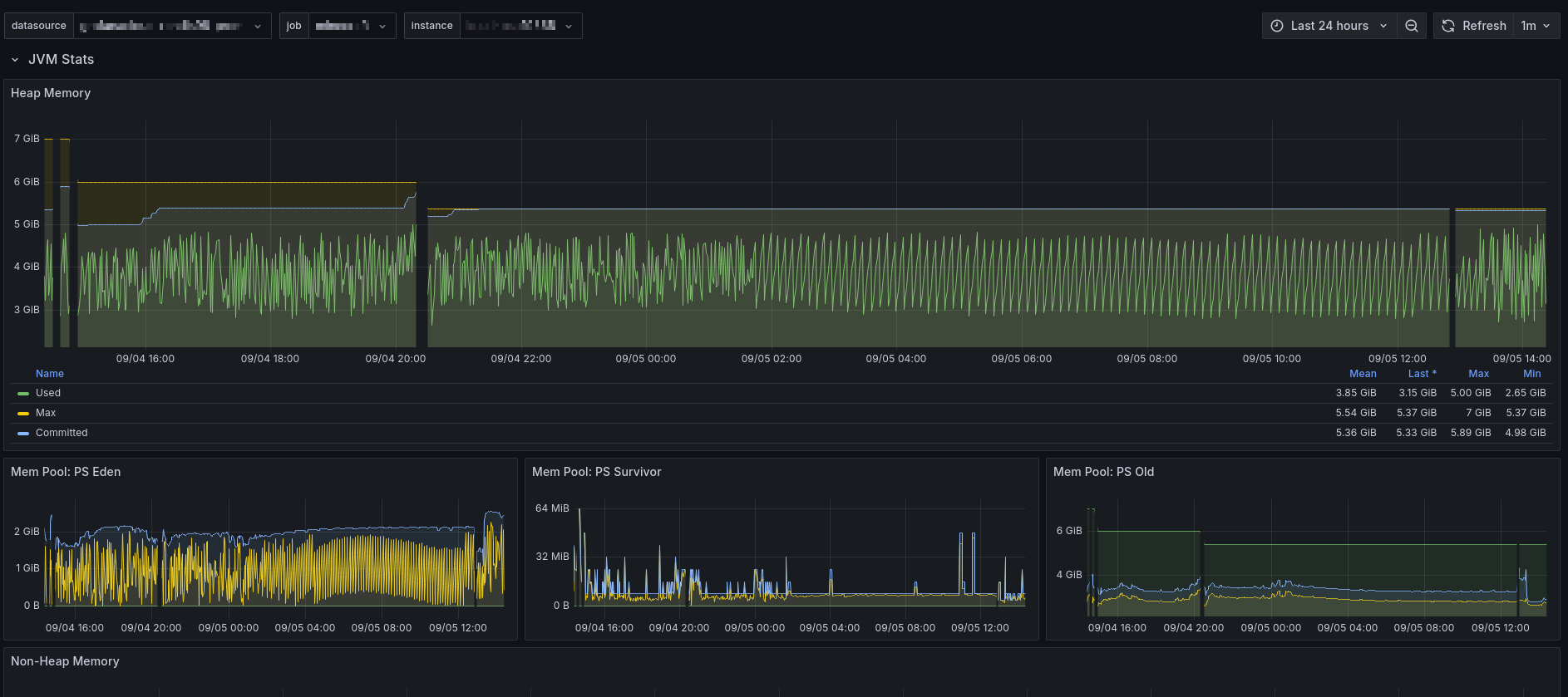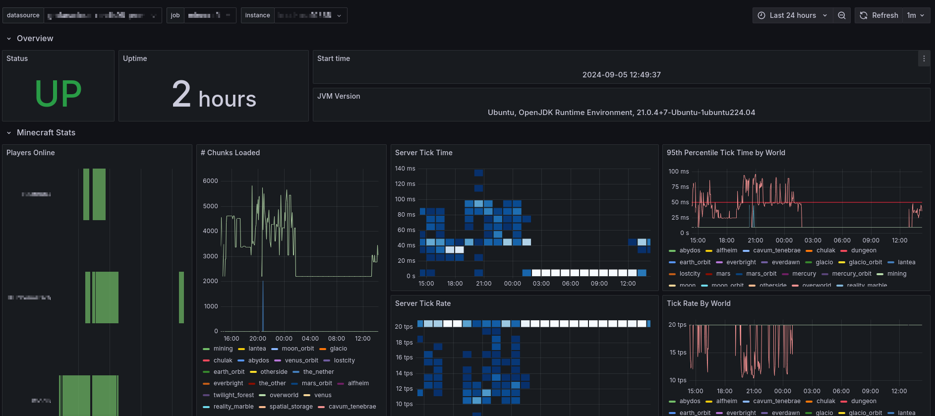 The Minecraft Server Stats dashboard uses the prometheus data source to create a Grafana dashboard with the graph, heatmap, stat, state-timeline and timeseries panels