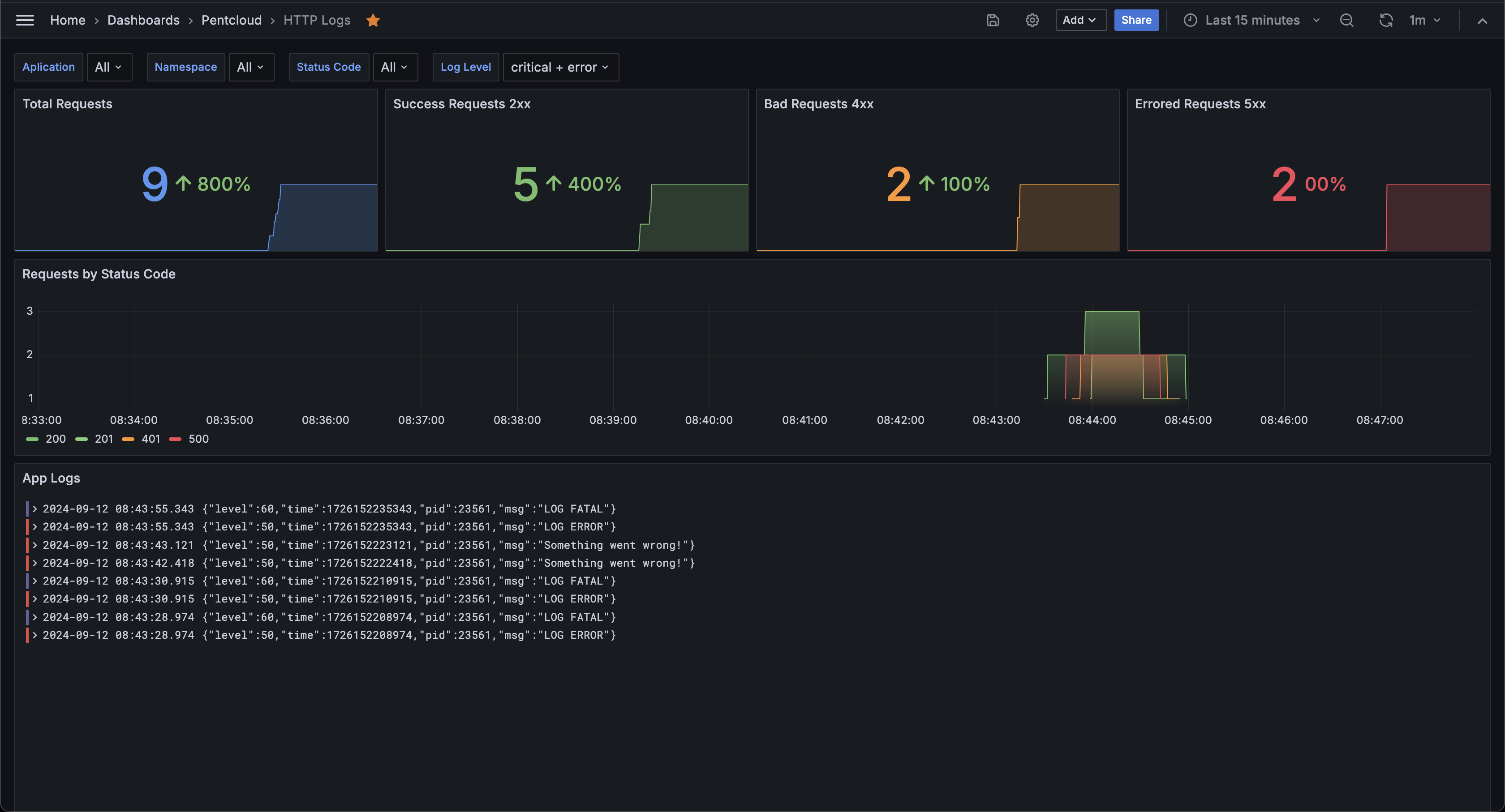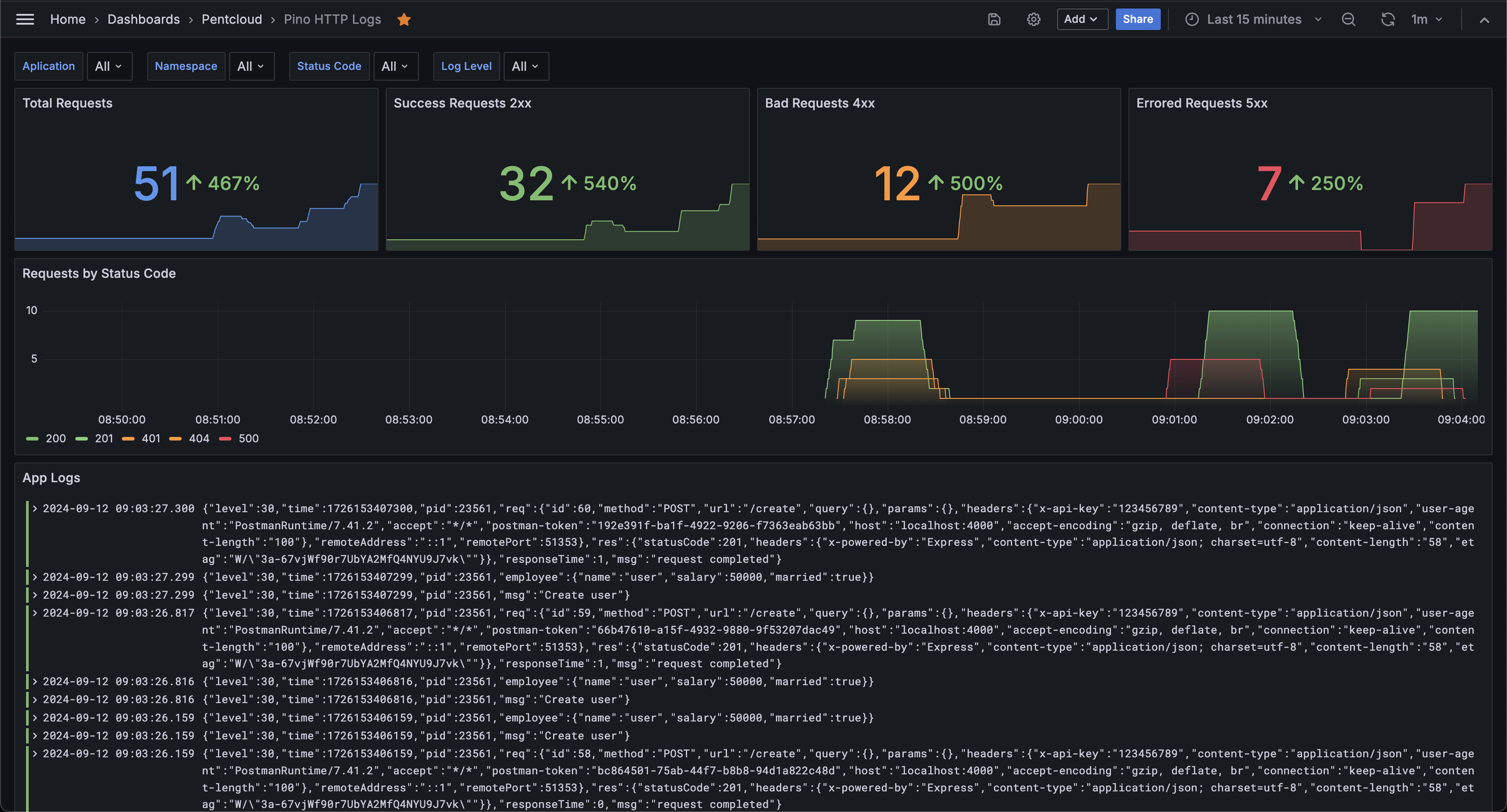 This Grafana dashboard utilizes the Loki data source to visualize and analyze logs generated by the Pino logging library. Logs from HTTP requests are captured using the Pino-HTTP plugin and are sent to a Loki instance via the Pino-Loki plugin, enabling real-time monitoring and historical analysis. The dashboard includes graph and table panels to display key metrics such as request status codes, response times, and error rates, making it easy to track application behavior and identify performance issues.