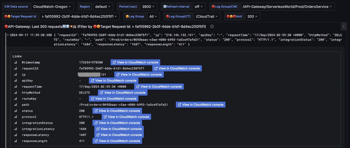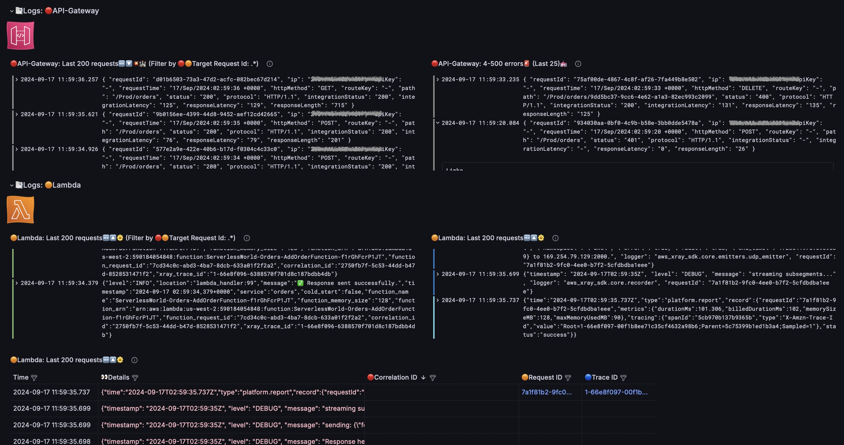 | 🟠AWS Lambda Performance Insights: | - Track Recent Lambda Executions: Examine detailed logs for the most recent Lambda invocations, including execution status, request ID, and X-Ray trace information. - Enhanced Lambda Debugging: Easily filter and find Lambda execution logs tied to specific API requests using correlation IDs from API Gateway and trace IDs. |