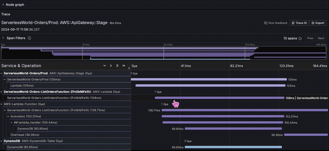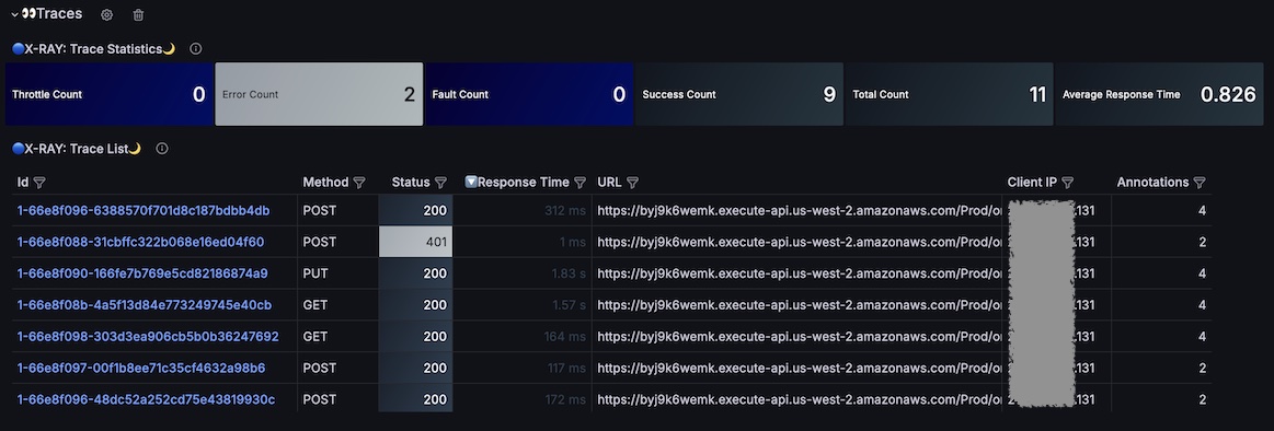| 🔵AWS X-Ray Trace Monitoring: | - Real-time Trace Visualization: Get a complete visual breakdown of API Gateway requests and Lambda invocations using X-Ray traces. Trace the path of a request as it moves through API Gateway, Lambda, and DynamoDB using Service Map.- Detailed Latency Breakdown: Understand the latency of each service involved in a transaction, helping you identify performance bottlenecks at a glance with the Flame Graph. |