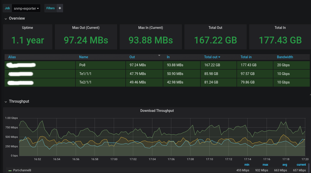 The SNMP Exporter dashboard uses the prometheus data source to create a Grafana dashboard with the graph, singlestat and table panels.