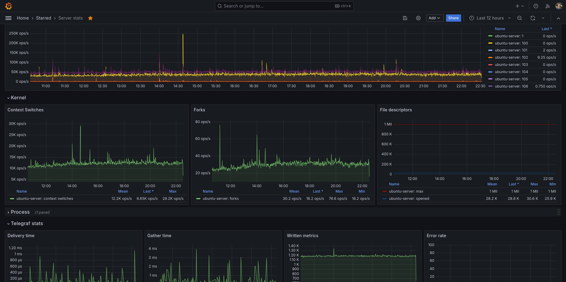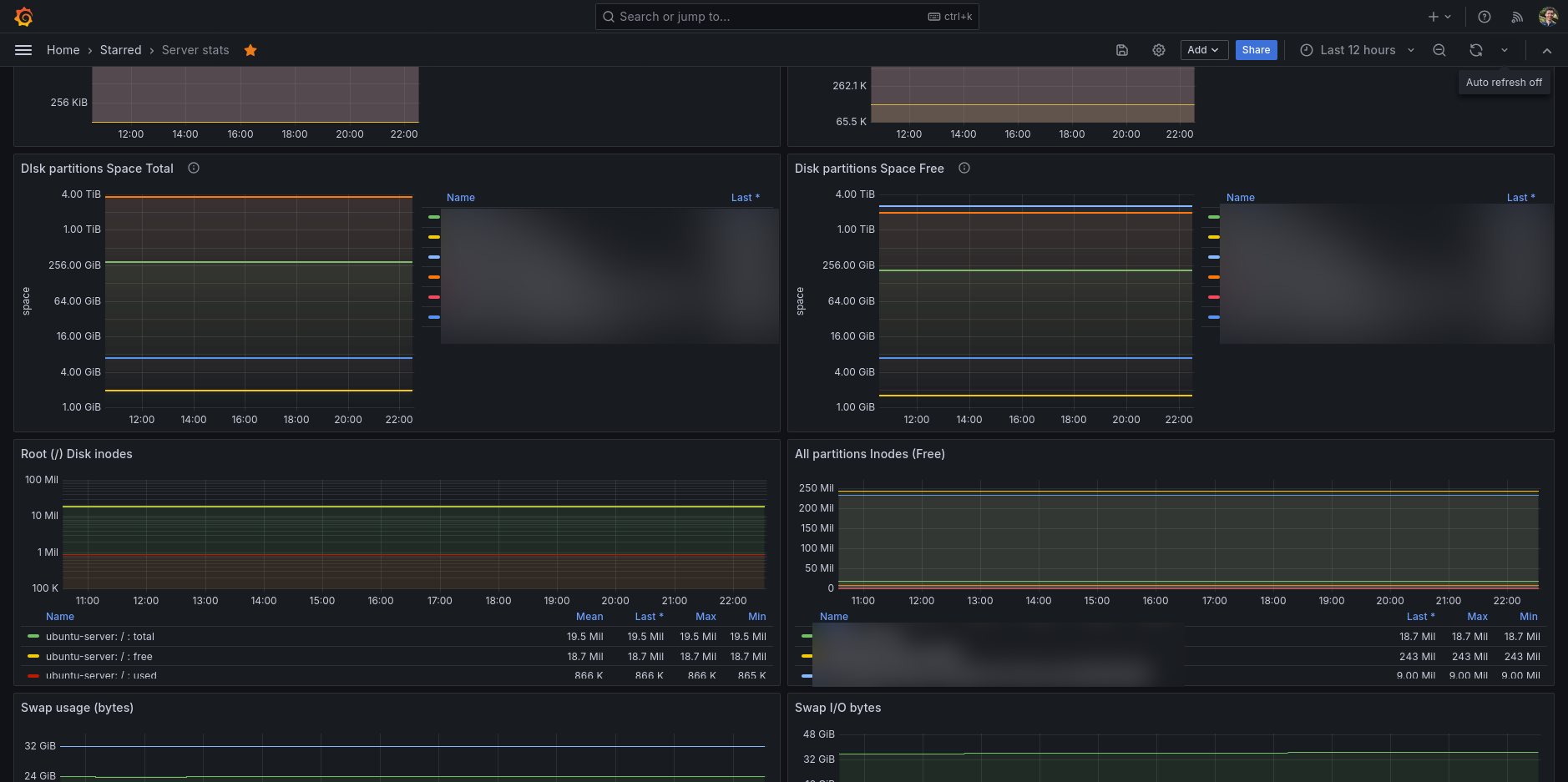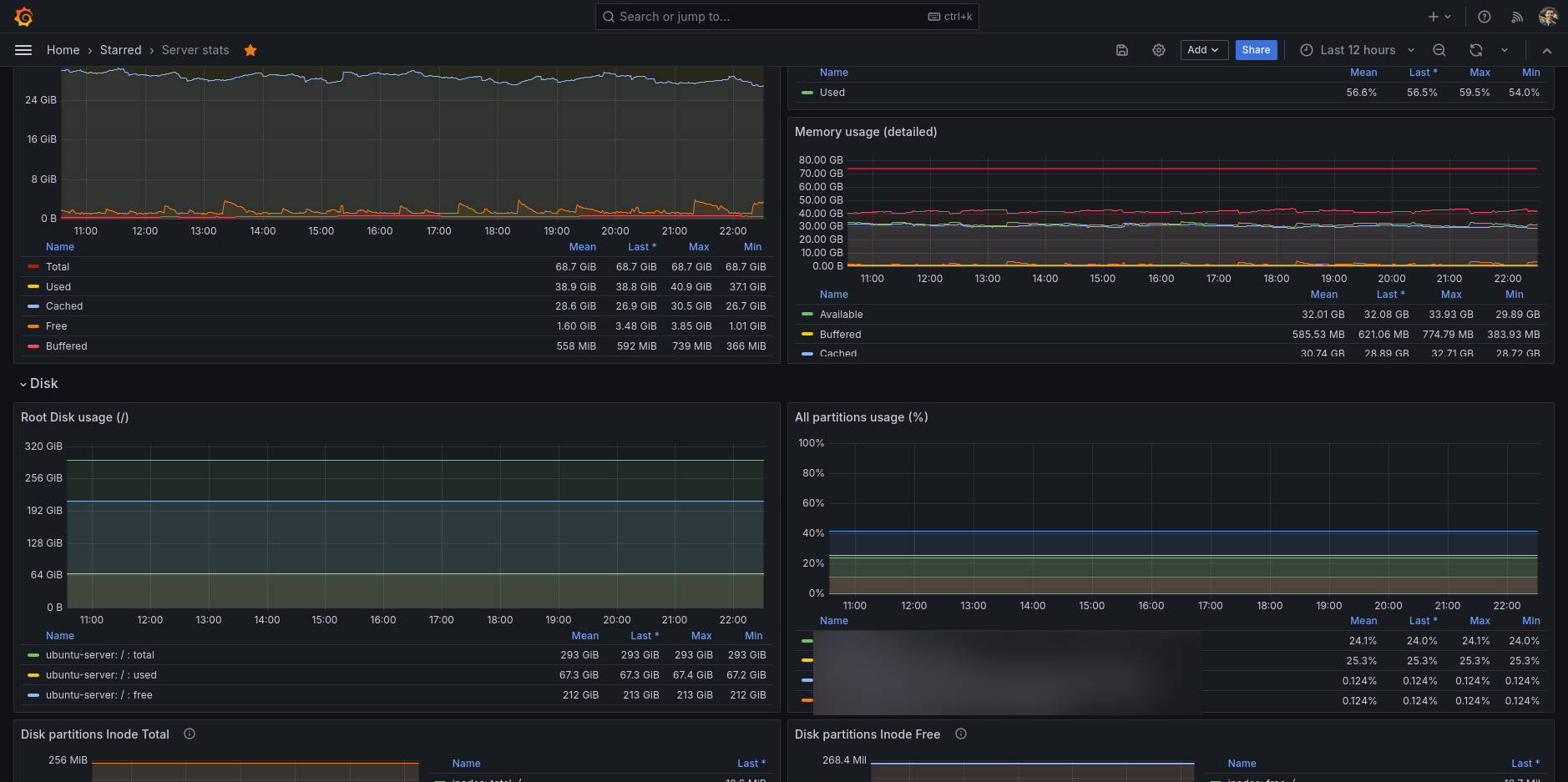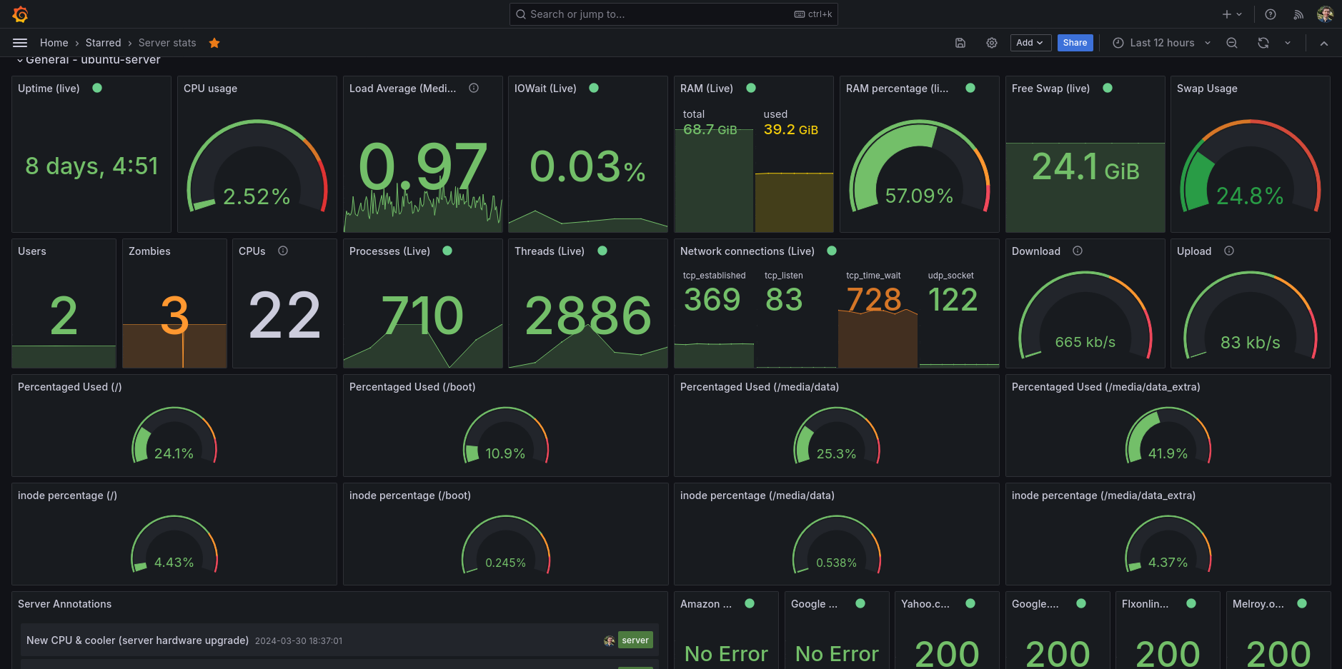 My main go-to Grafana dashboard for my Ubuntu server. A full featured dashboard showing you all the information you ever want to know about your GNU/Linux server.