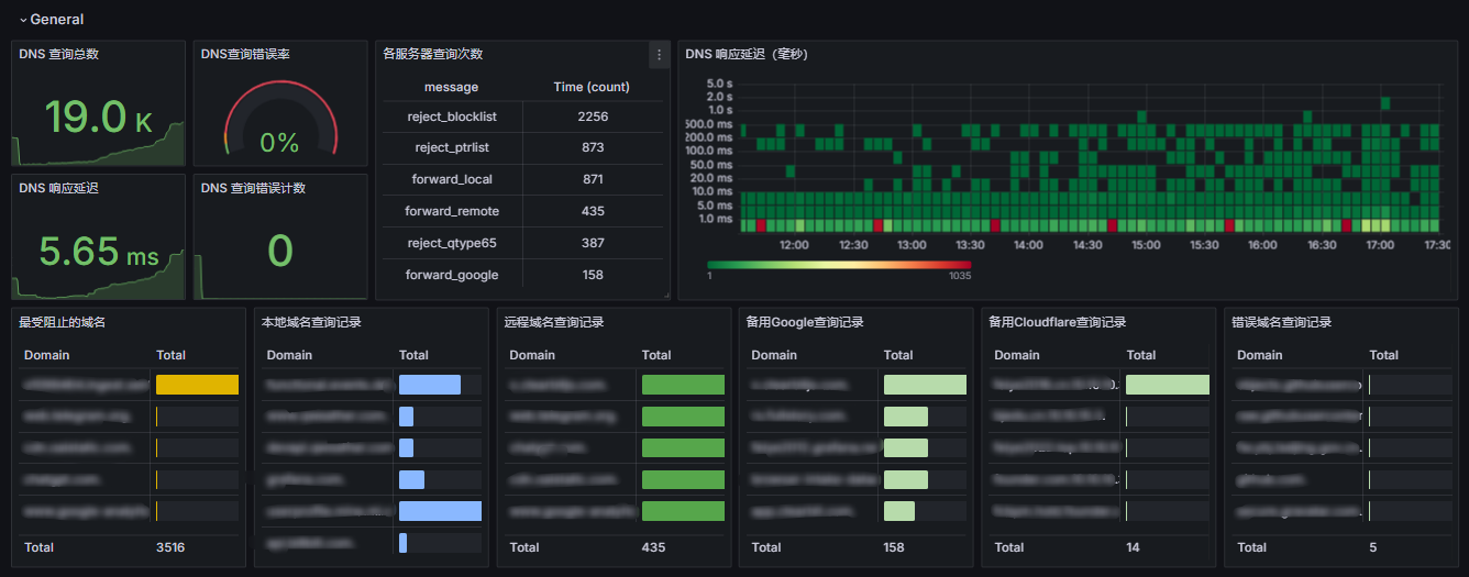 The mosdnsv7 dashboard uses the loki and prometheus data sources to create a Grafana dashboard with the gauge, heatmap, stat and table panels.
