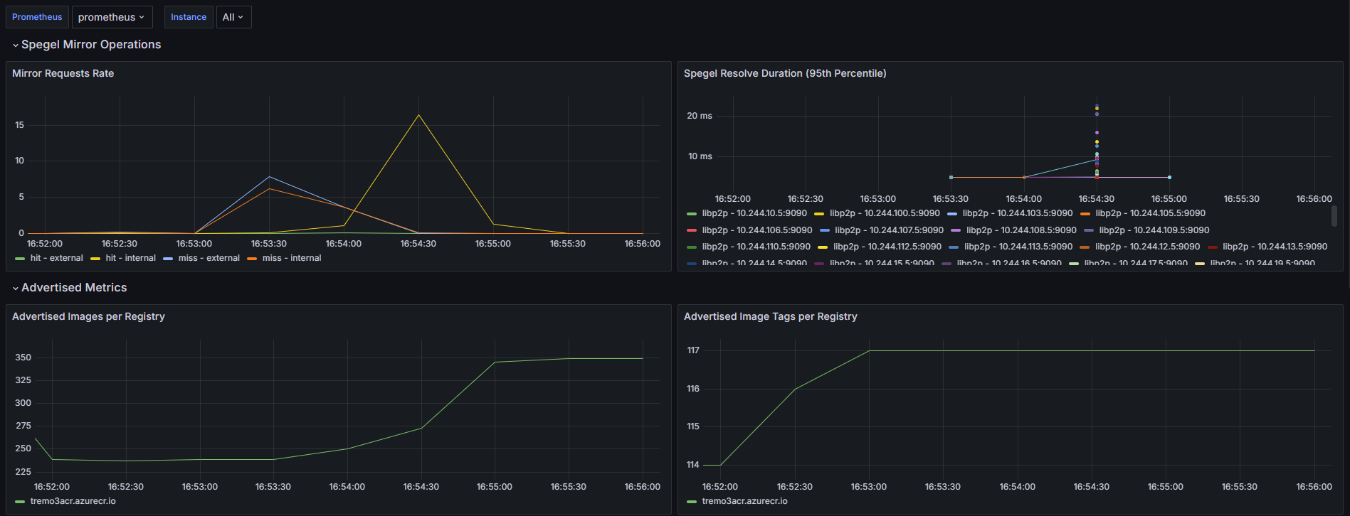 A comprehensive Grafana dashboard for monitoring Spegel, focusing on Spegel-specific metrics such as mirror requests, resolve durations, advertised images, and HTTP metrics.