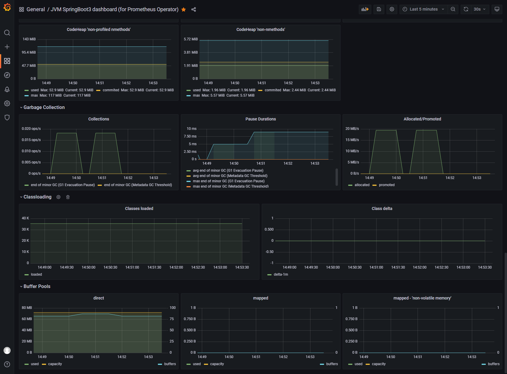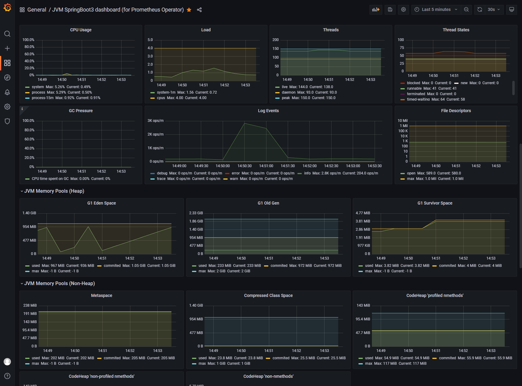 After upgrading the Spring Boot 3 application, suitable Grafana dashboards for the Prometheus Operator were not available, so I integrated them. I referenced dashboards with ID 8878 and ID 4701. Thank you for your contributions.