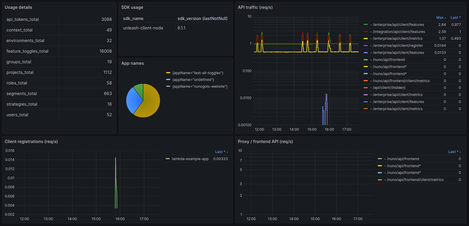 The Unleash dashboard dashboard uses the prometheus data source to create a Grafana dashboard with the piechart, table and timeseries panels.
