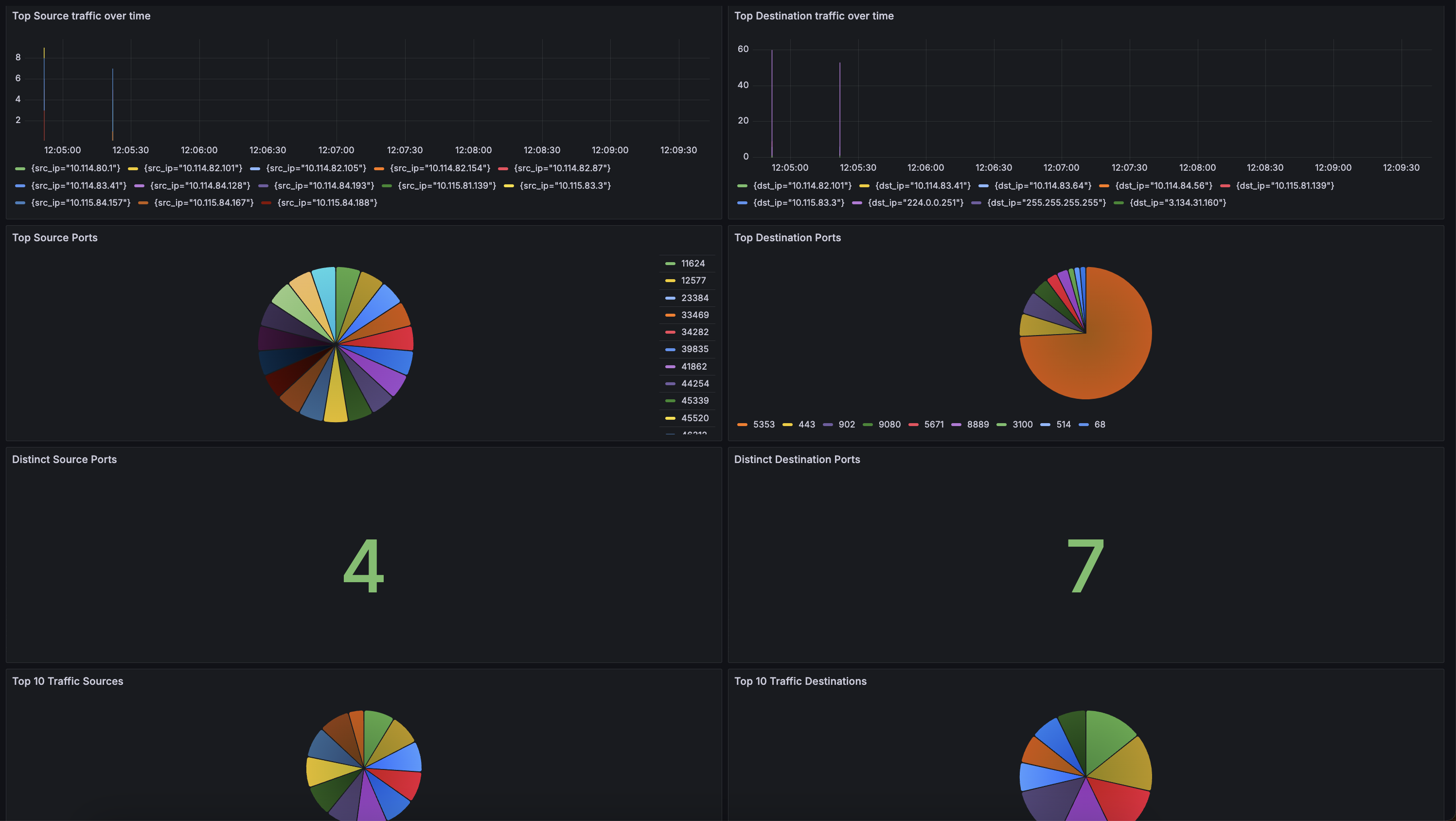 The Top Traffic Source and Destination Dashboard provides key insights into network traffic patterns, helping you monitor and analyze data flow across your infrastructure. It features top source and destination traffic over time, allowing you to visualize traffic trends and detect any unusual spikes or drops. Additionally, the dashboard highlights top source and destination ports, which offers visibility into the most frequently used ports and can help identify potential security risks or optimization opportunities.
