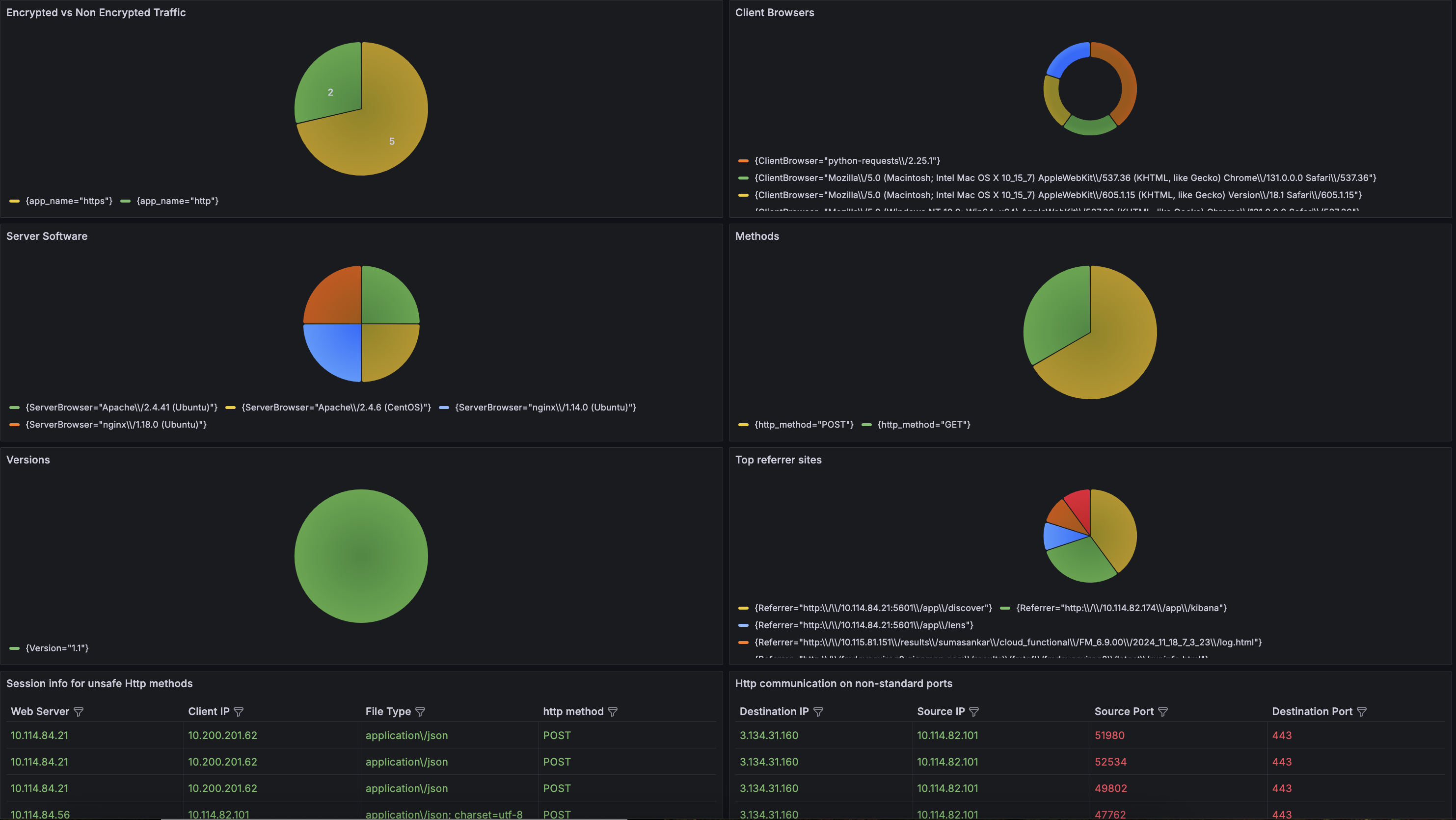 The Web Traffic Dashboard provides a comprehensive view of web traffic patterns, helping to monitor security and user behavior. It offers insights into encrypted vs. non-encrypted traffic, allowing you to assess the security of data transmissions and ensure that sensitive information is adequately protected.